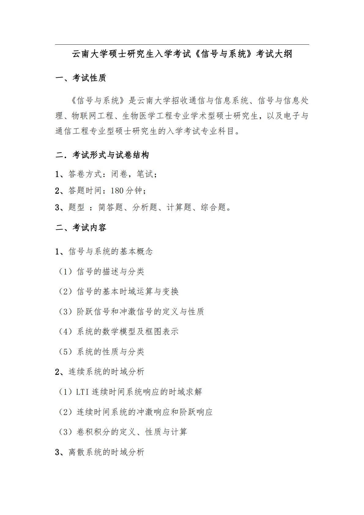云南大学硕士研究生入学考试《信号与系统》考试大纲一、考试性质《信号与系统》是云南大学招收通信与信息系统、信号与信息处理、物联网工程、生物医学工程专业学术型硕士研究生,以及电子与通信工程专业型硕士研究生的入学考试专业科目。二.考试形式与试卷结构1、答卷方式:闭卷,笔试;2、答题时间:180分钟;3、题型:简答题、分析题、计算题、综合题。二、考试内容1、信号与系统的基本概念(1)信号的描述与分类(2)信号的基本时域运算与变换(3)阶跃信号和冲激信号的定义与性质(4)系统的数学模型及框图表示(5)系统的性质与分类2、连续系统的时域分析(1)LTI连续时间系统响应的时域求解(2)连续时间系统的冲激响应...