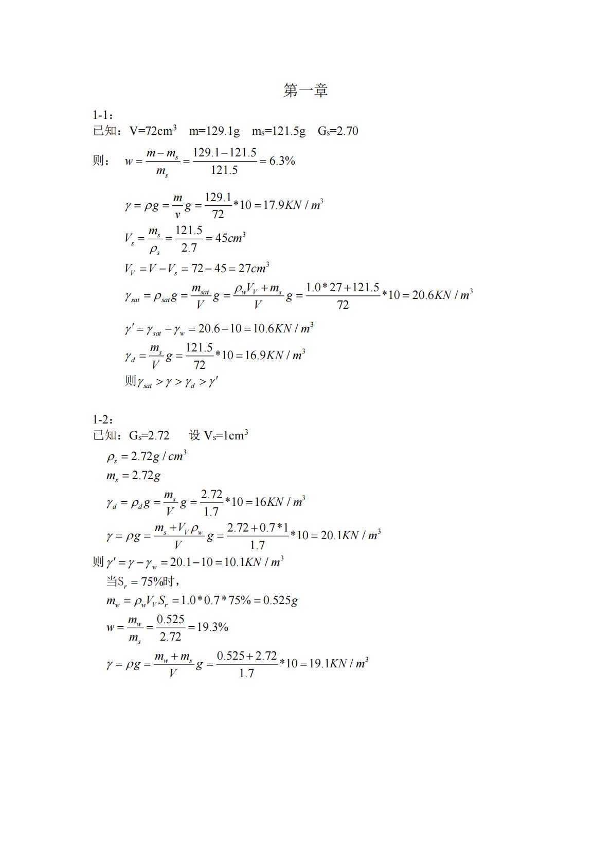 第一章1-1:已知:V=72cm3m=129.1gms=121.5gGs=2.70则:129.1121.56.3%121.5ssmmwm−−===3333129.1*1017.9/72121.5452.77245271.0*27121.5*1020.6/72sssVssatwVssatsatmggKNmvmVcmVVVcmmVmgggKNmVVγρρργρ========−=−=++=====3320.61010.6/121.5*1016.9/72satwsdsatdKNmmgKNmVγγγγγγγγ′=−=−====′>>>则1-2:已知:Gs=2.72设Vs=1cm3则33332.72/2...