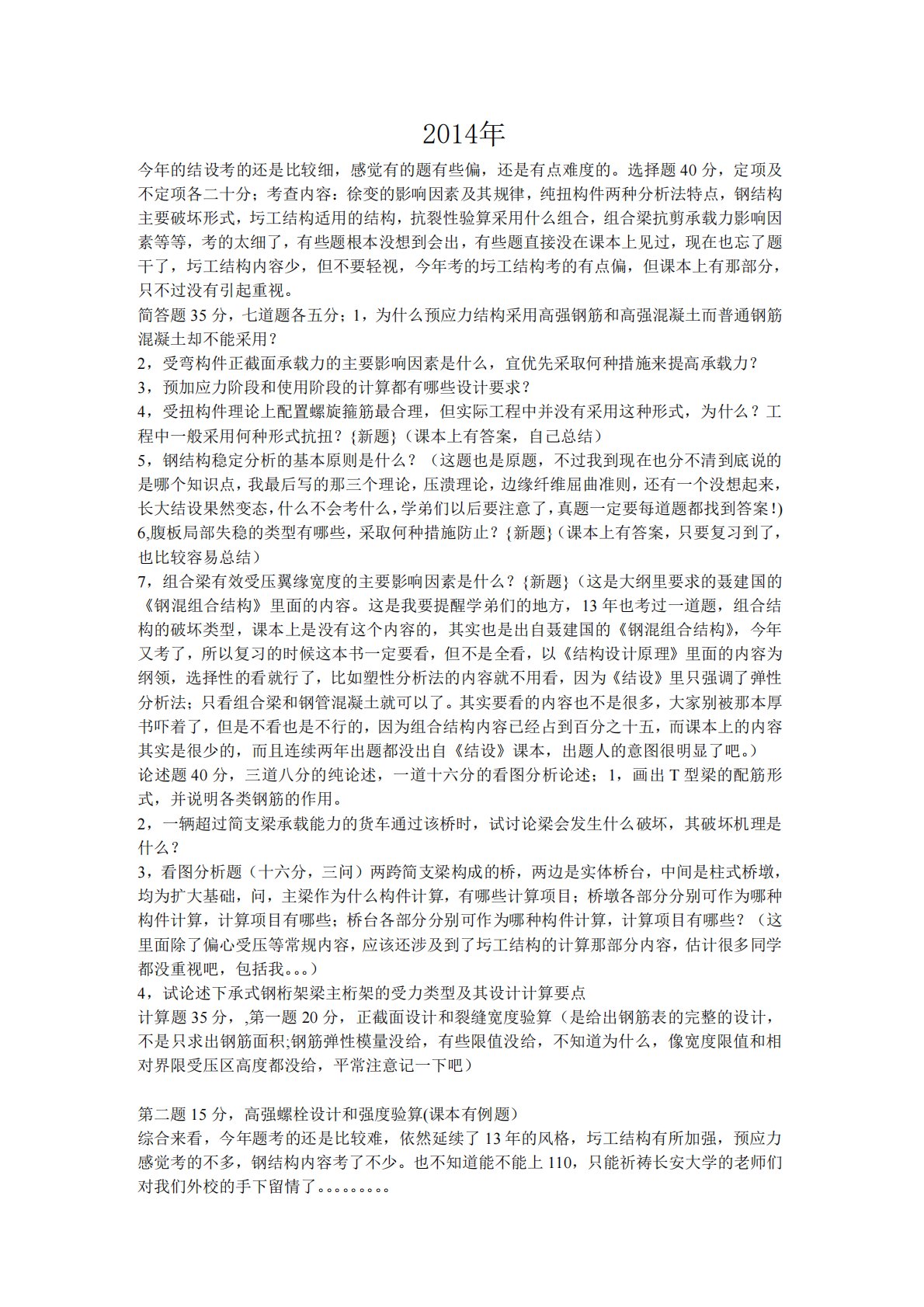 第二题15分,高强螺栓设计和强度验算(课本有例题)综合来看,今年题考的还是比较难,依然延续了13年的风格,圬工结构有所加强,预应力感觉考的不多,钢结构内容考了不少。也不知道能不能上110,只能祈祷长安大学的老师们对我们外校的手下留情了。。。。。。。。。构的破坏类型,课本上是没有这个内容的,其实也是出自聂建国的《钢混组合结构》,今年又考了,所以复习的时候这本书一定要看,但不是全看,以《结构设计原理》里面的内容为纲领,选择性的看就行了,比如塑性分析法的内容就不用看,因为《结设》里只强调了弹性分析法;只看组合梁和钢管混凝土就可以了。其实要看的内容也不是很多,大家别被那本厚书吓着了,但是不看也是不行的...
