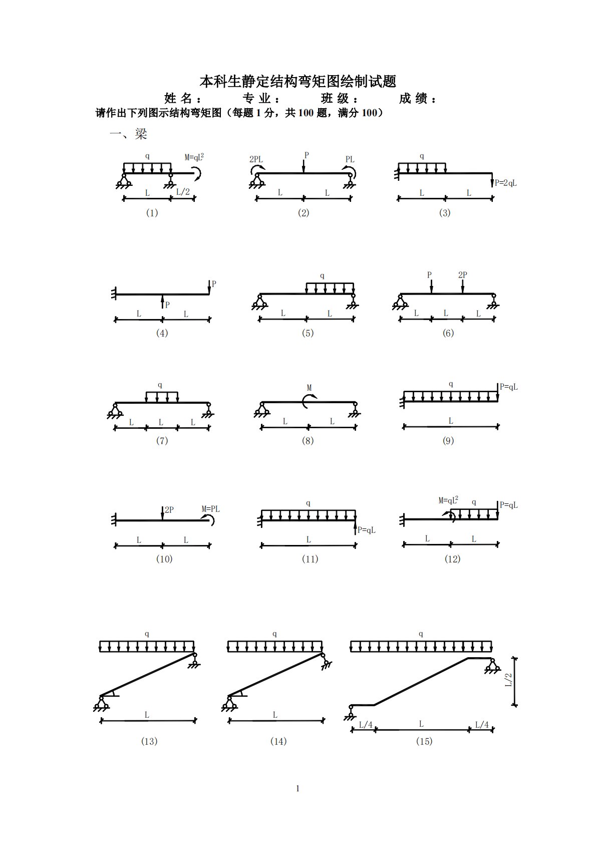 1本科生静定结构弯矩图绘制试题姓名:专业:班级:成绩:请作出下列图示结构弯矩图(每题1分,共100题,满分100)(15)(14)(13)(12)(11)(10)(9)(8)(7)(6)(5)(4)(3)(2)(1)一、梁L/2L/4L/4qLqLqL2M=qLP=qLLqLqLP=qLM=PL2PLLqLP=qLMLLqLLLL2PPLLLqLPLLPP=2qLLqLPL2PLPLLL/22M=qLqL2qLL(22)(21)(20)(19)二、悬臂式刚架(18)(17)(16)PPLLL/2L/2L/2L/2030PLL2M=qaP=qaP=2qaqq4a2aaa2a2aa3aM=2qaq...
