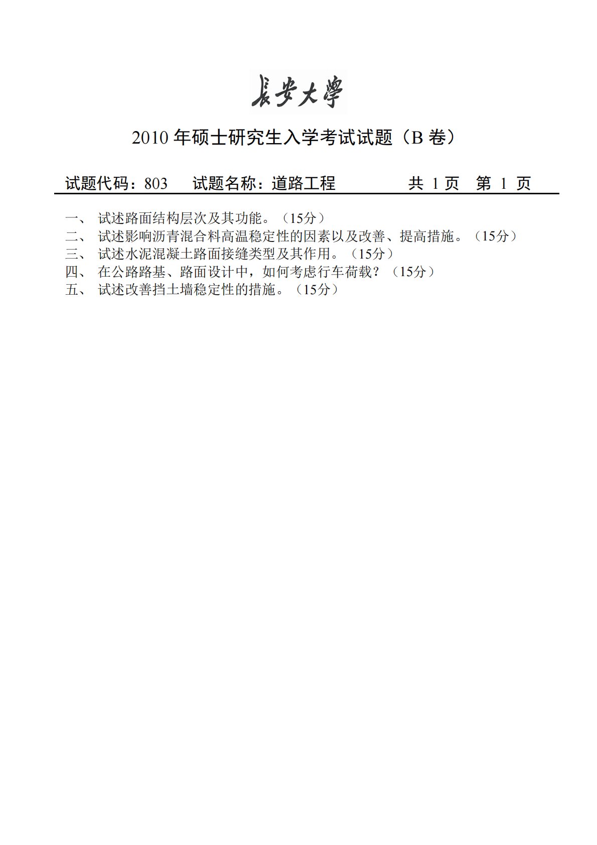 2010年硕士研究生入学考试试题(B卷)试题代码:803试题名称:道路工程共1页第1页一、试述路面结构层次及其功能。(15分)二、试述影响沥青混合料高温稳定性的因素以及改善、提高措施。(15分)三、试述水泥混凝土路面接缝类型及其作用。(15分)四、在公路路基、路面设计中,如何考虑行车荷载?(15分)五、试述改善挡土墙稳定性的措施。(15分)2010年硕士研究生入学考试试题(B卷)试题代码:803试题名称:道路工程共1页第1页一、试述路面结构层次及其功能。(15分)二、试述影响沥青混合料高温稳定性的因素以及改善、提高措施。(15分)三、试述水泥混凝土路面接缝类型及其作用。(15分)四、在公路路基...