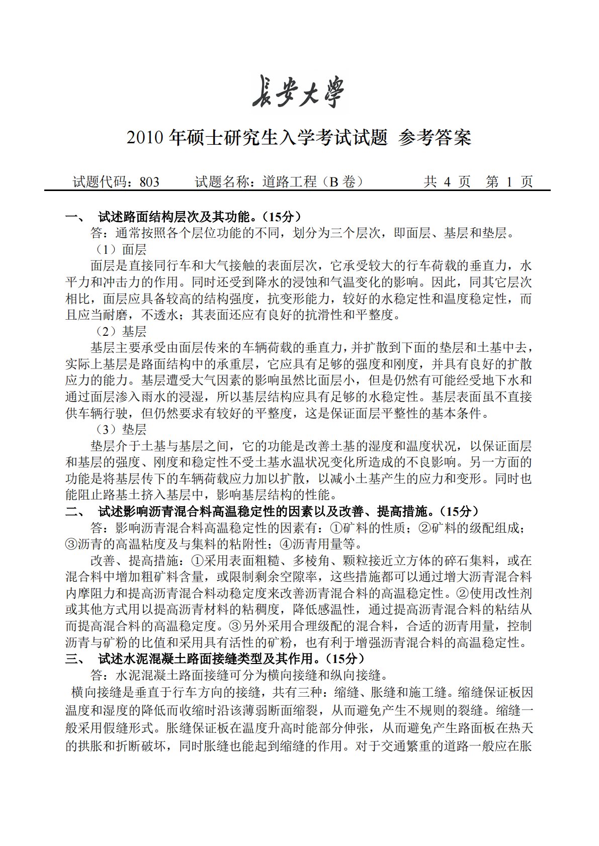 2010年硕士研究生入学考试试题参考答案试题代码:803试题名称:道路工程(B卷)共4页第1页一、试述路面结构层次及其功能。(15分)答:通常按照各个层位功能的不同,划分为三个层次,即面层、基层和垫层。(1)面层面层是直接同行车和大气接触的表面层次,它承受较大的行车荷载的垂直力,水平力和冲击力的作用。同时还受到降水的浸蚀和气温变化的影响。因此,同其它层次相比,面层应具备较高的结构强度,抗变形能力,较好的水稳定性和温度稳定性,而且应当耐磨,不透水;其表面还应有良好的抗滑性和平整度。(2)基层基层主要承受由面层传来的车辆荷载的垂直力,并扩散到下面的垫层和土基中去,实际上基层是路面结构中的承重层,它...