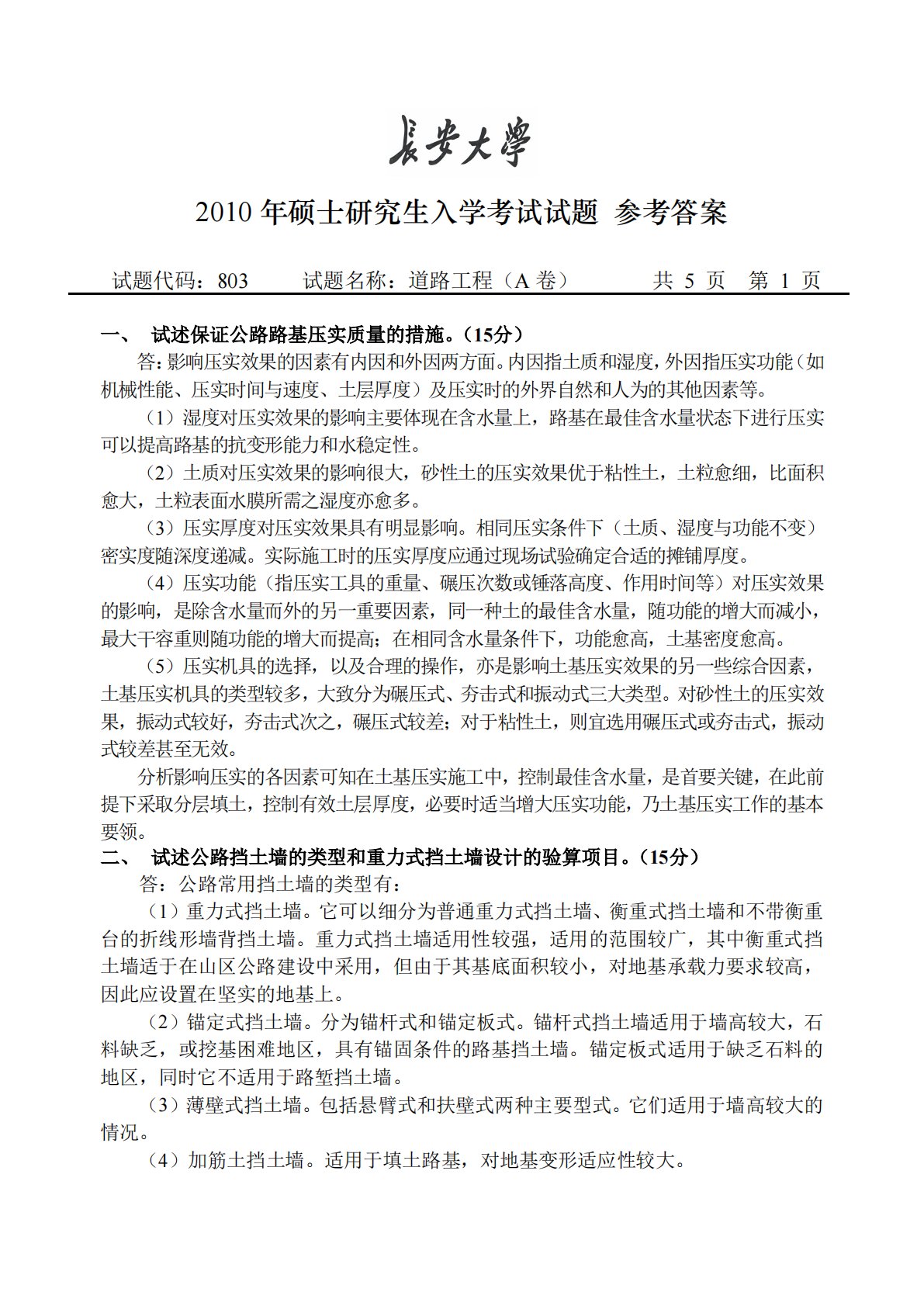 2010年硕士研究生入学考试试题参考答案试题代码:803试题名称:道路工程(A卷)共5页第1页一、试述保证公路路基压实质量的措施。(15分)答:影响压实效果的因素有内因和外因两方面。内因指土质和湿度,外因指压实功能(如机械性能、压实时间与速度、土层厚度)及压实时的外界自然和人为的其他因素等。(1)湿度对压实效果的影响主要体现在含水量上,路基在最佳含水量状态下进行压实可以提高路基的抗变形能力和水稳定性。(2)土质对压实效果的影响很大,砂性土的压实效果优于粘性土,土粒愈细,比面积愈大,土粒表面水膜所需之湿度亦愈多。(3)压实厚度对压实效果具有明显影响。相同压实条件下(土质、湿度与功能不变)密实度随...