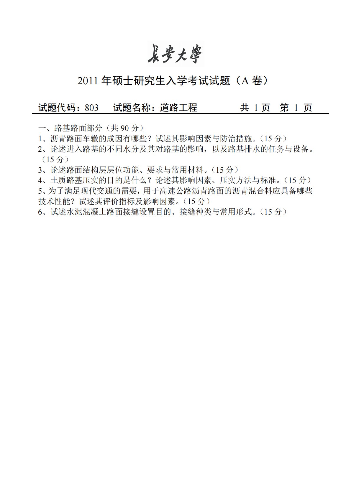 2011年硕士研究生入学考试试题(A卷)试题代码:803试题名称:道路工程共1页第1页一、路基路面部分(共90分)1、沥青路面车辙的成因有哪些?试述其影响因素与防治措施。(15分)2、论述进入路基的不同水分及其对路基的影响,以及路基排水的任务与设备。(15分)3、论述路面结构层层位功能、要求与常用材料。(15分)4、土质路基压实的目的是什么?论述其影响因素、压实方法与标准。(15分)5、为了满足现代交通的需要,用于高速公路沥青路面的沥青混合料应具备哪些技术性能?试述其评价指标及影响因素。(15分)6、试述水泥混凝土路面接缝设置目的、接缝种类与常用形式。(15分)2011年硕士研究生入学考试试题...