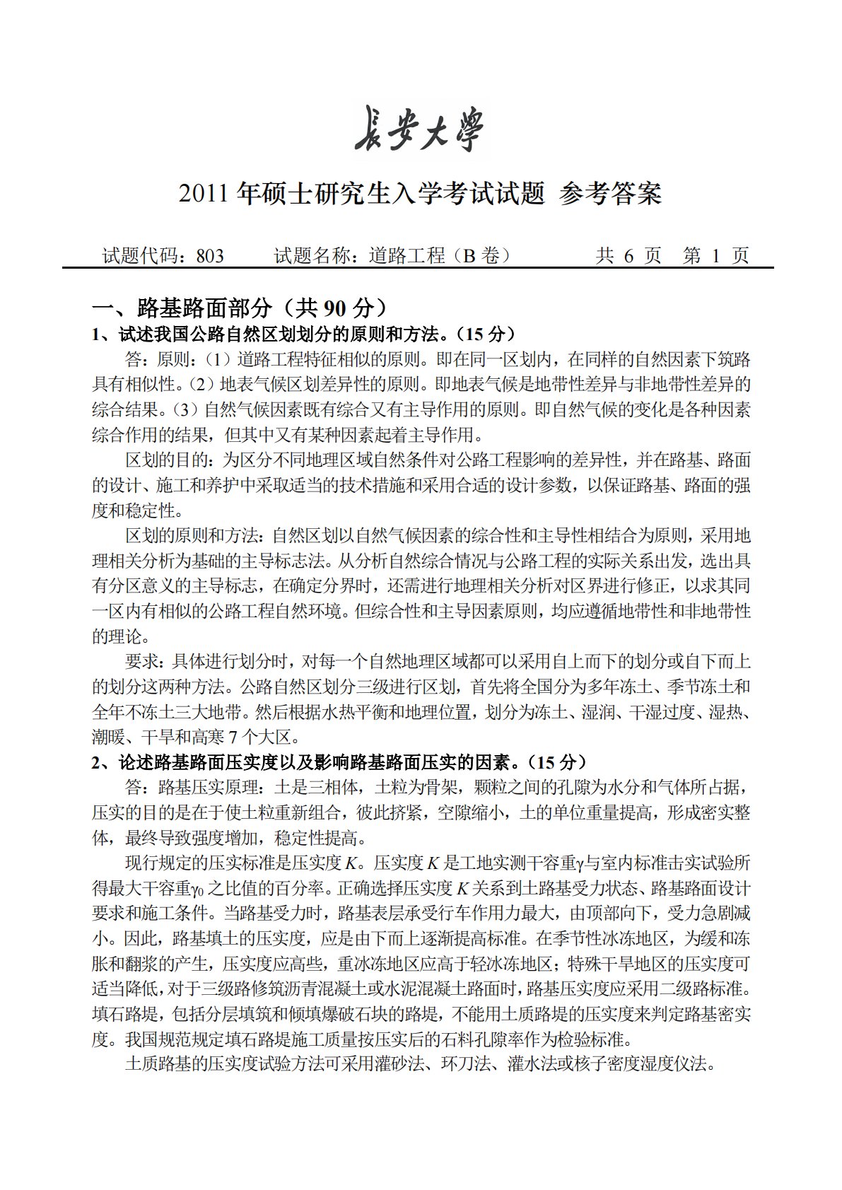 2011年硕士研究生入学考试试题参考答案试题代码:803试题名称:道路工程(B卷)共6页第1页一、路基路面部分(共90分)1、试述我国公路自然区划划分的原则和方法。(15分)答:原则:(1)道路工程特征相似的原则。即在同一区划内,在同样的自然因素下筑路具有相似性。(2)地表气候区划差异性的原则。即地表气候是地带性差异与非地带性差异的综合结果。(3)自然气候因素既有综合又有主导作用的原则。即自然气候的变化是各种因素综合作用的结果,但其中又有某种因素起着主导作用。区划的目的:为区分不同地理区域自然条件对公路工程影响的差异性,并在路基、路面的设计、施工和养护中采取适当的技术措施和采用合适的设计参数,...