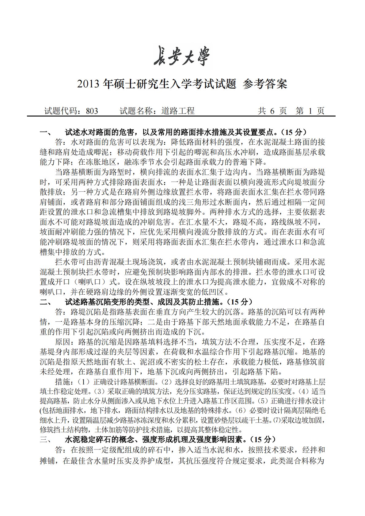 2013年硕士研究生入学考试试题参考答案试题代码:803试题名称:道路工程共6页第1页一、试述水对路面的危害,以及常用的路面排水措施及其设置要点。(15分)答:水对路面的危害可以表现为:降低路面材料的强度,在水泥混凝土路面的接缝和路肩处造成唧泥;移动荷载作用下引起的唧泥和高压水冲刷,造成路面基层承载能力下降;在冻胀地区,融冻季节水会引起路面承载力的普遍下降。当路基横断面为路堑时,横向排流的表面水汇集于边沟内。当路基横断面为路堤时,可采用两种方式排除路面表面水:一种是让路面表面以横向漫流形式向堤坡面分散排放;另一种方式是在路肩外侧边缘放置拦水带,将路面表面水汇集在拦水带同路肩铺面,或者路肩和部分...