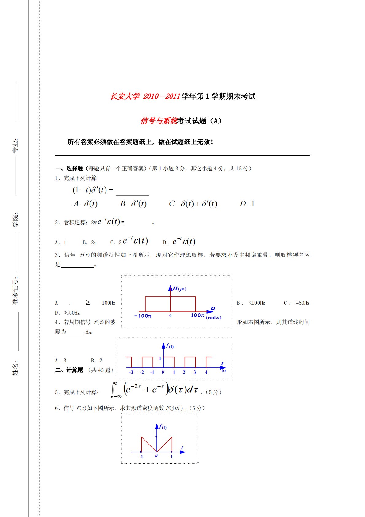 特别说明:et)所提供的资料均来自于历年长安大学2010—2011学年第1学期期末考试信号与系统考试试题(A)所有答案必须做在答案题纸上,做在试题纸上无效!一、选择题(每题只有一个正确答案)(第1小题3分,其它小题4分,共15分)1.完成下列计算ttAtBtCttD(1)().().().()().12.卷积运算:2*tet()=。A.1B.2;C.2tet()D.tet()3.信号f(t)的频谱特性如下图所示。现对它作理想取样,若要求不发生频谱重叠,则取样频率应是。A.100HzB.