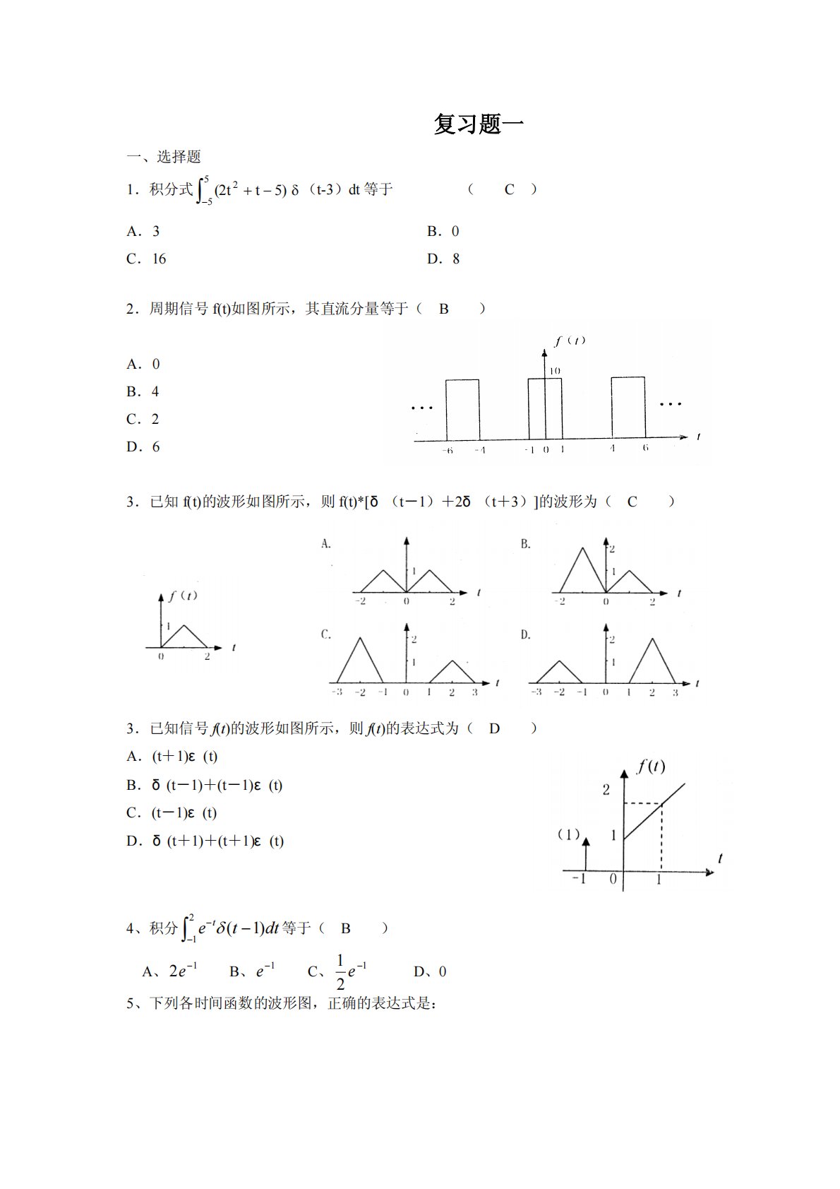 复习题一一、选择题1.积分式(2tt5)255(t-3)dt等于(C)A.3B.0C.16D.82.周期信号f(t)如图所示,其直流分量等于(B)A.0B.4C.2D.63.已知f(t)的波形如图所示,则f(t)*[δ(t-1)+2δ(t+3)]的波形为(C)3.已知信号f(t)的波形如图所示,则f(t)的表达式为(D)A.(t+1)ε(t)B.δ(t-1)+(t-1)ε(t)C.(t-1)ε(t)D.δ(t+1)+(t+1)ε(t)4、积分tetdt(1)12等于(B)A、e21B、e1C、e121D、05、下列各时间函数的波形图,正确的表达式是:(A)t[(t)...