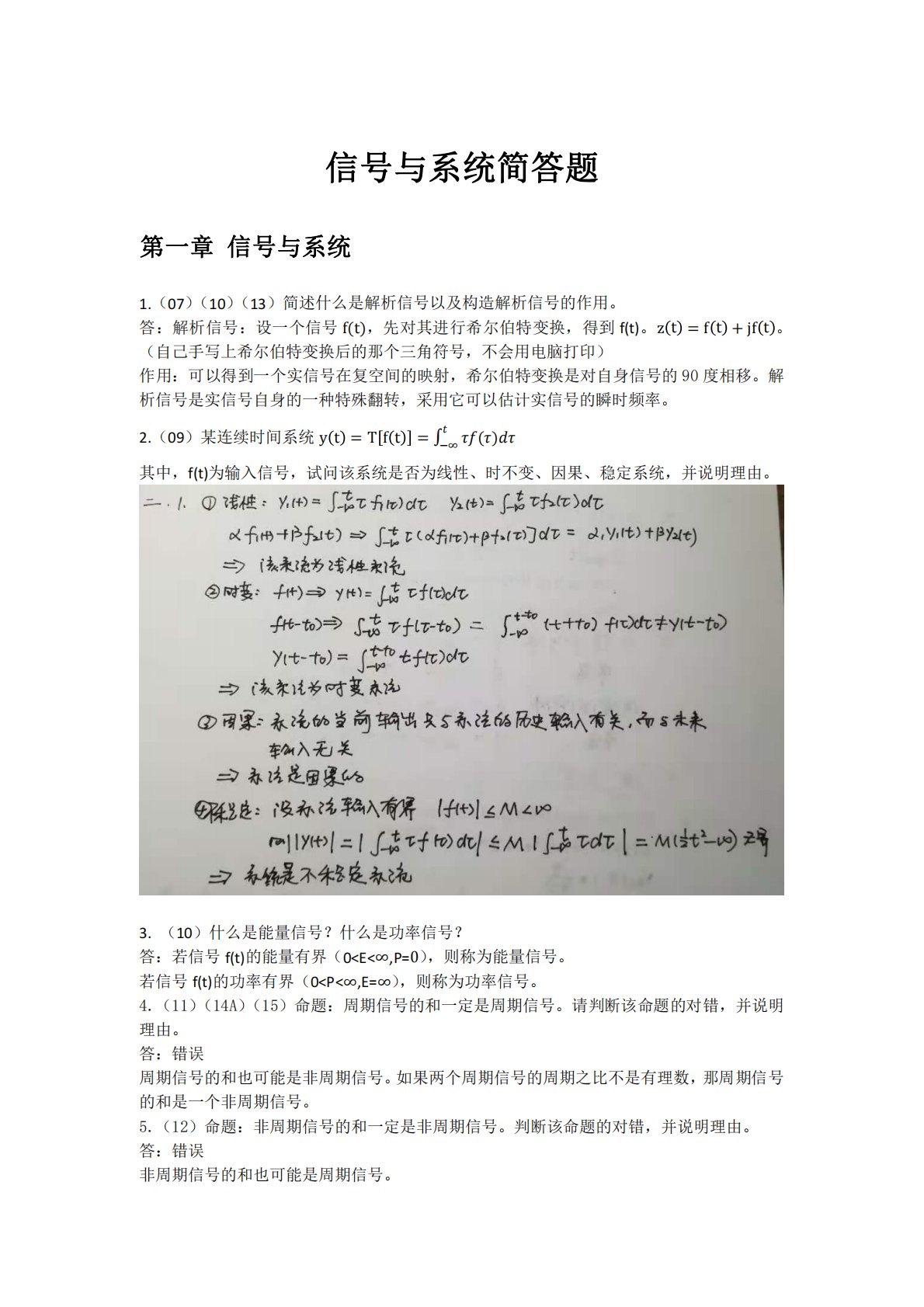 信号与系统简答题第一章信号与系统1.(07)(10)(13)简述什么是解析信号以及构造解析信号的作用。答:解析信号:设一个信号f(t),先对其进行希尔伯特变换,得到f(t)。zt=ft+jft。(自己手写上希尔伯特变换后的那个三角符号,不会用电脑打印)作用:可以得到一个实信号在复空间的映射,希尔伯特变换是对自身信号的90度相移。解析信号是实信号自身的一种特殊翻转,采用它可以估计实信号的瞬时频率。2.(09)某连续时间系统yt=Tft=()其中,f(t)为输入信号,试问该系统是否为线性、时不变、因果、稳定系统,并说明理由。3.(10)什么是能量信号?什么是功率信号?答:若信号f(t)的能量有界(...