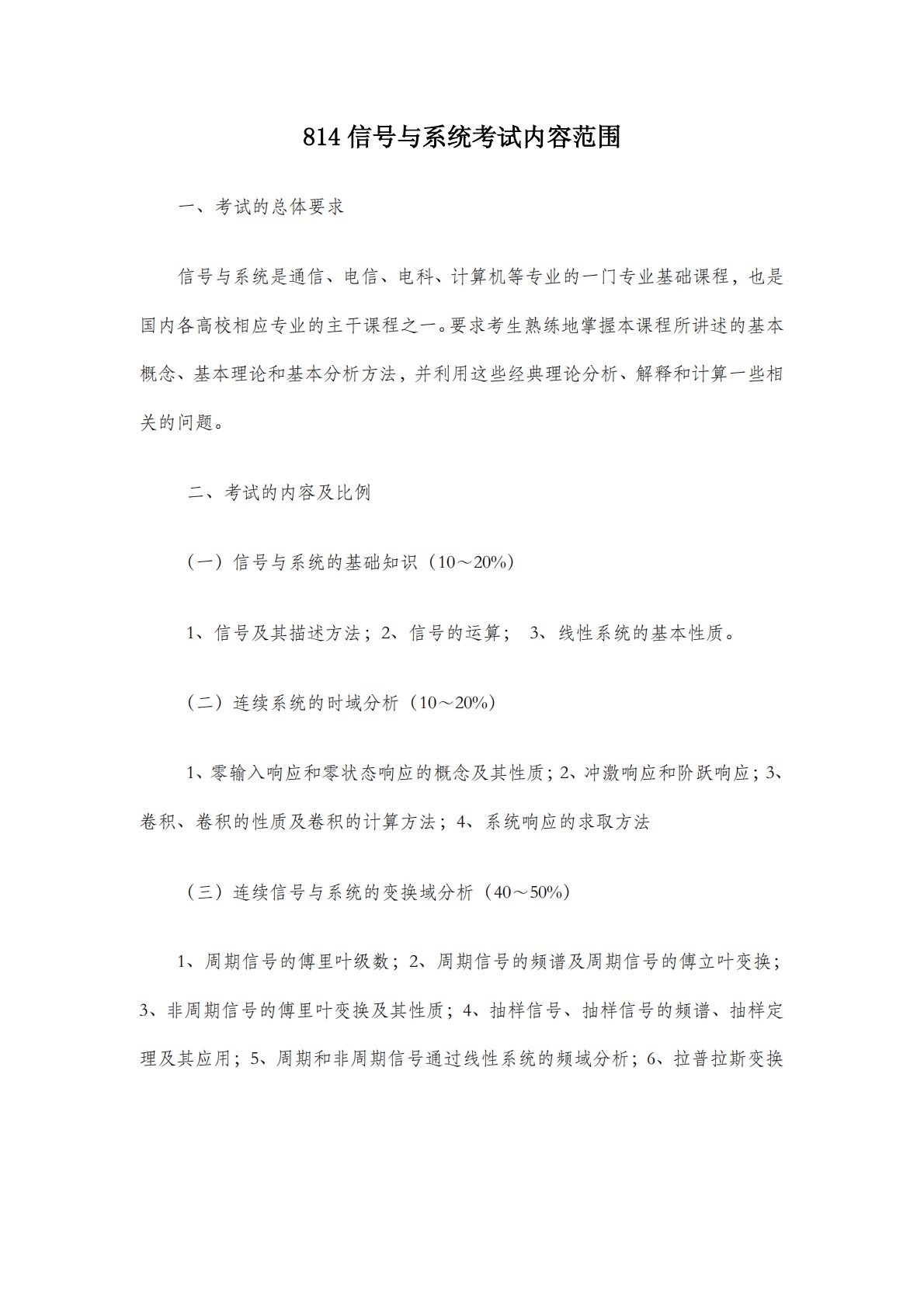 814信号与系统考试内容范围一、考试的总体要求信号与系统是通信、电信、电科、计算机等专业的一门专业基础课程,也是国内各高校相应专业的主干课程之一。要求考生熟练地掌握本课程所讲述的基本概念、基本理论和基本分析方法,并利用这些经典理论分析、解释和计算一些相关的问题。二、考试的内容及比例(一)信号与系统的基础知识(10~20%)1、信号及其描述方法;2、信号的运算;3、线性系统的基本性质。(二)连续系统的时域分析(10~20%)1、零输入响应和零状态响应的概念及其性质;2、冲激响应和阶跃响应;3、卷积、卷积的性质及卷积的计算方法;4、系统响应的求取方法(三)连续信号与系统的变换域分析(40~50%)...