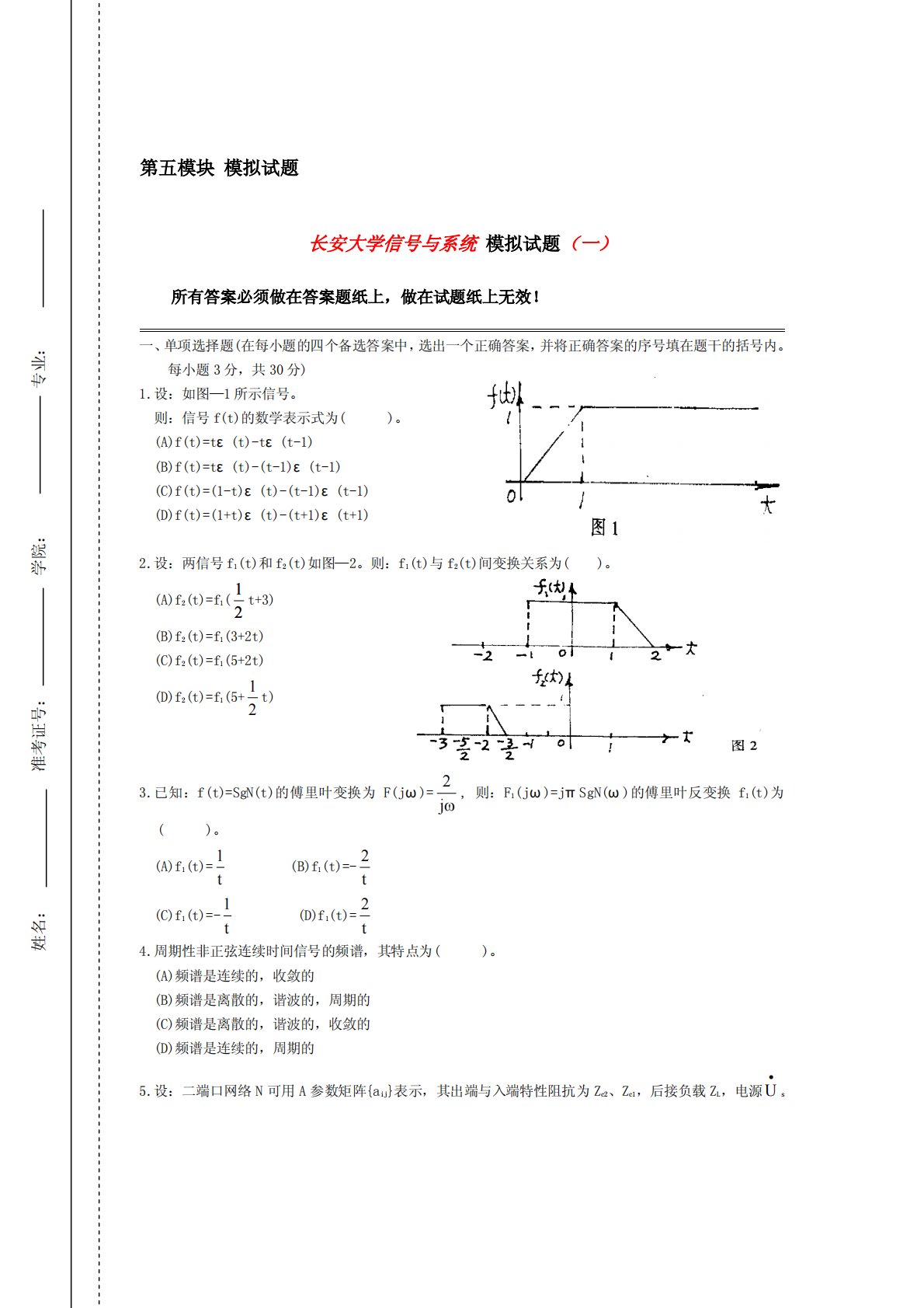 第五模块模拟试题长安大学信号与系统模拟试题(一)所有答案必须做在答案题纸上,做在试题纸上无效!一、单项选择题(在每小题的四个备选答案中,选出一个正确答案,并将正确答案的序号填在题干的括号内。每小题3分,共30分)1.设:如图—1所示信号。则:信号f(t)的数学表示式为()。(A)f(t)=tε(t)-tε(t-1)(B)f(t)=tε(t)-(t-1)ε(t-1)(C)f(t)=(1-t)ε(t)-(t-1)ε(t-1)(D)f(t)=(1+t)ε(t)-(t+1)ε(t+1)2.设:两信号f1(t)和f2(t)如图—2。则:f1(t)与f2(t)间变换关系为()。(A)f2(t)=f1(12...