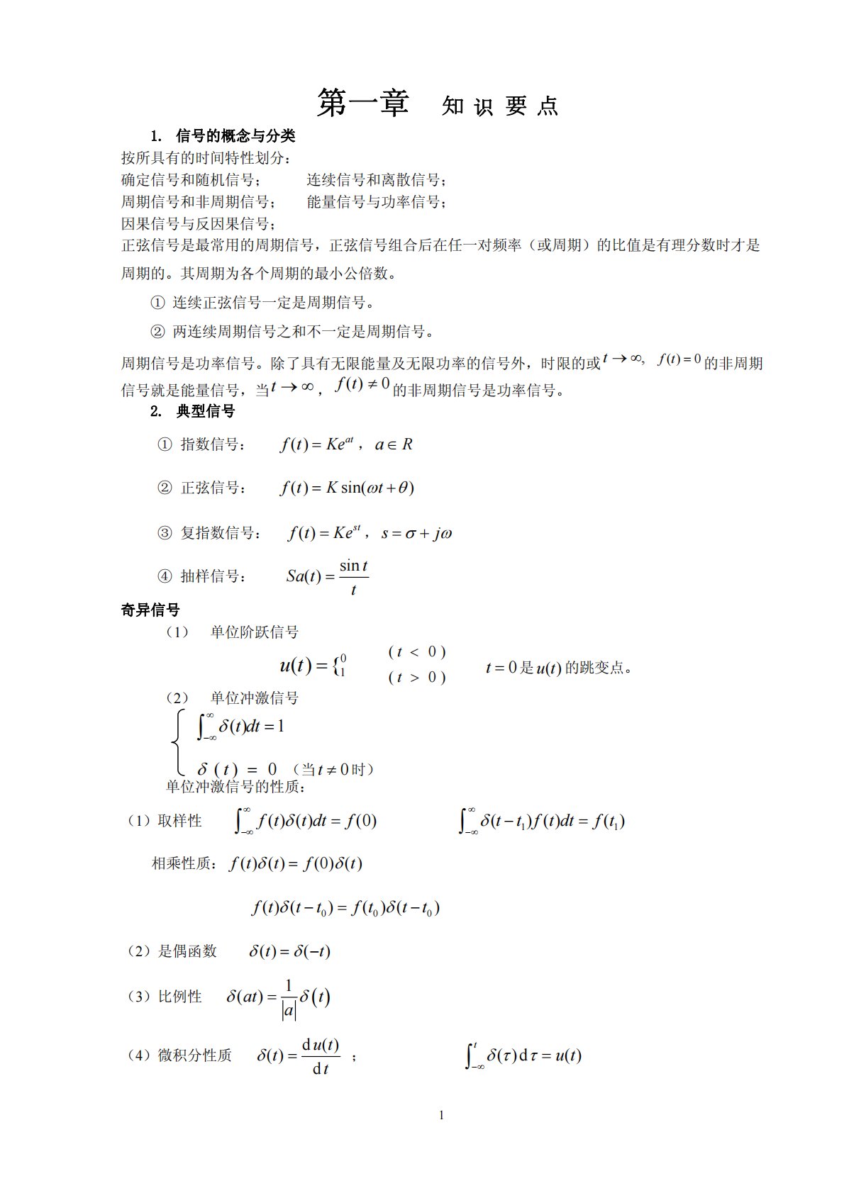 第一章识知要点1.信号的概念与分类按所具有的时间特性划分:确定信号和随机信号;连续信号和离散信号;周期信号和非周期信号;能量信号与功率信号;因果信号与反因果信号;正弦信号是最常用的周期信号,正弦信号组合后在任一对频率(或周期)的比值是有理分数时才是周期的。其周期为各个周期的最小公倍数。①连续正弦信号一定是周期信号。②两连续周期信号之和不一定是周期信号。周期信号是功率信号。除了具有无限能量及无限功率的信号外,时限的或的非周期信号就是能量信号,当,,∞→t0)(=tf∞→t0)(≠tf的非周期信号是功率信号。2.典型信号①指数信号:()atftKe=,a∈R②正弦信号:()sin()ftKtωθ=...