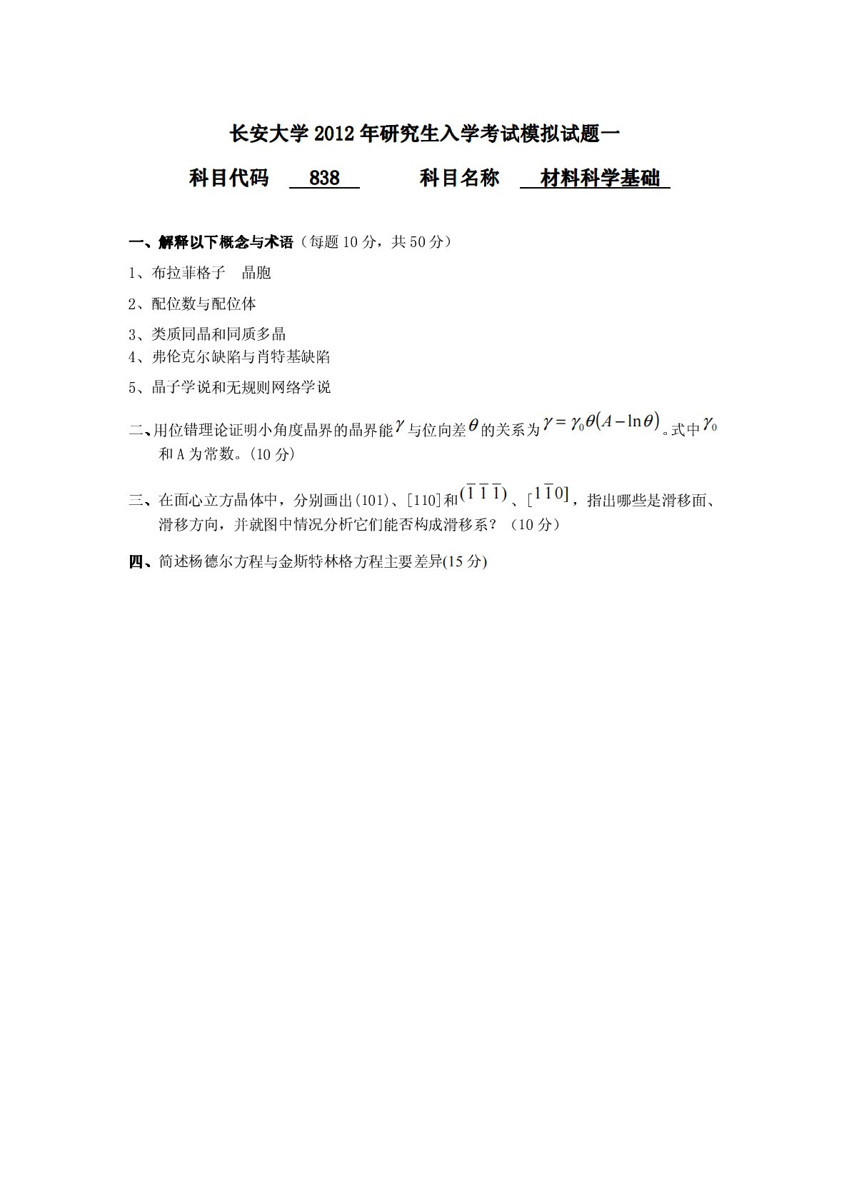 长安大学838材料科学基础2012年模拟试题