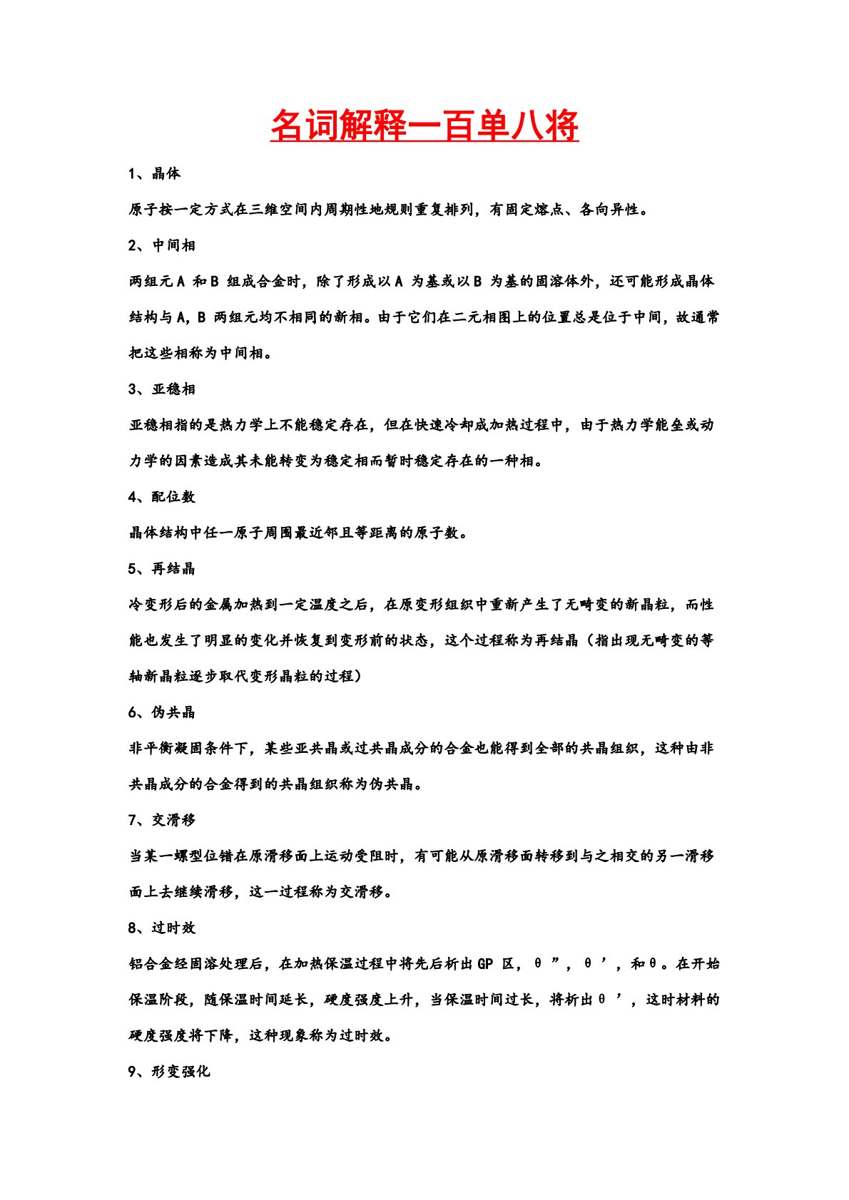 名词解释一百单八将1、晶体原子按一定方式在三维空间内周期性地规则重复排列,有固定熔点、各向异性。2、中间相两组元A和B组成合金时,除了形成以A为基或以B为基的固溶体外,还可能形成晶体结构与A,B两组元均不相同的新相。由于它们在二元相图上的位置总是位于中间,故通常把这些相称为中间相。3、亚稳相亚稳相指的是热力学上不能稳定存在,但在快速冷却成加热过程中,由于热力学能垒或动力学的因素造成其未能转变为稳定相而暂时稳定存在的一种相。4、配位数晶体结构中任一原子周围最近邻且等距离的原子数。5、再结晶冷变形后的金属加热到一定温度之后,在原变形组织中重新产生了无畸变的新晶粒,而性能也发生了明显的变化并恢复到变...