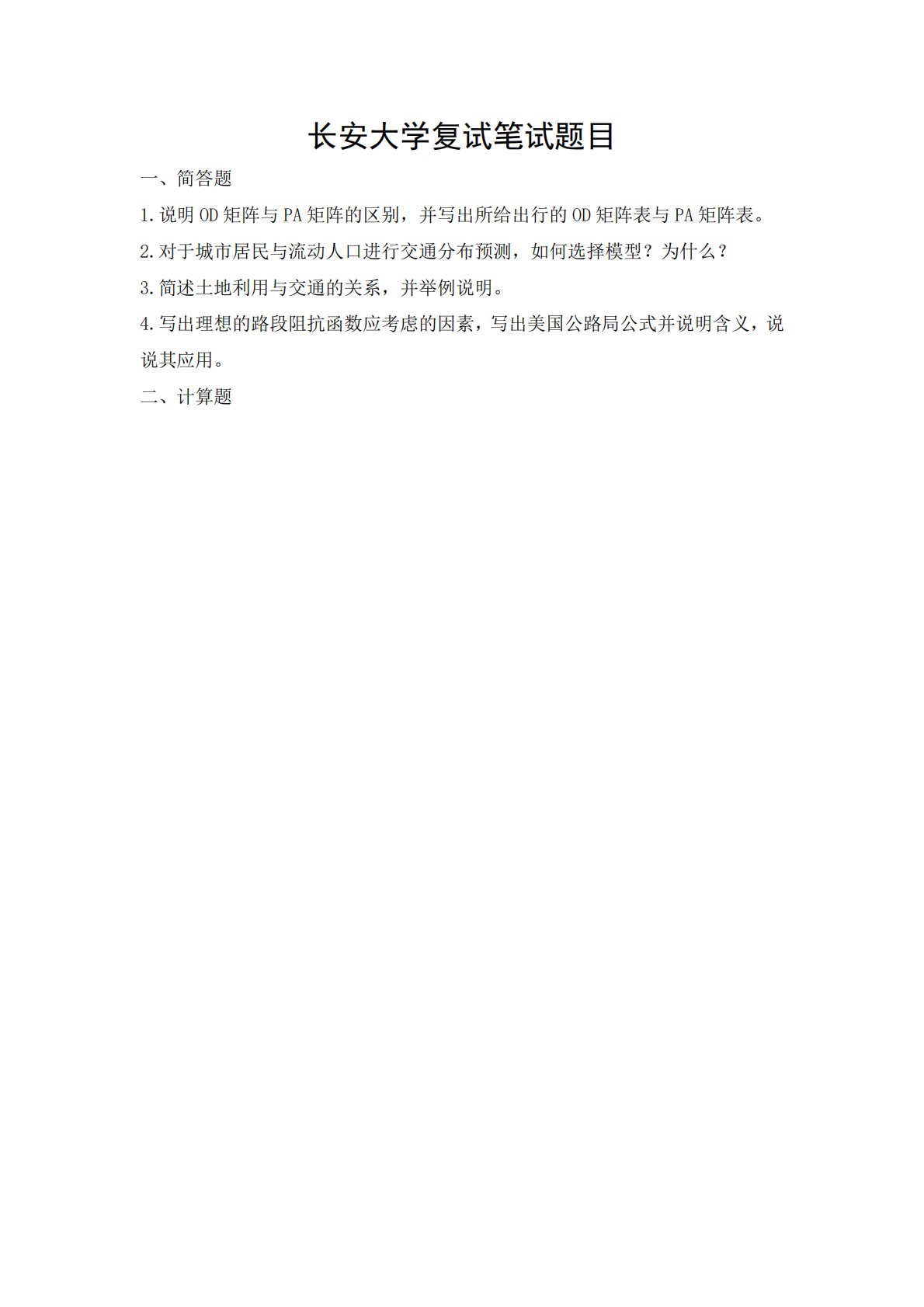 长安大学复试笔试题目一、简答题1.说明OD矩阵与PA矩阵的区别,并写出所给出行的OD矩阵表与PA矩阵表。2.对于城市居民与流动人口进行交通分布预测,如何选择模型?为什么?3.简述土地利用与交通的关系,并举例说明。4.写出理想的路段阻抗函数应考虑的因素,写出美国公路局公式并说明含义,说说其应用。二、计算题长安大学复试笔试题目一、简答题1.说明OD矩阵与PA矩阵的区别,并写出所给出行的OD矩阵表与PA矩阵表。2.对于城市居民与流动人口进行交通分布预测,如何选择模型?为什么?3.简述土地利用与交通的关系,并举例说明。4.写出理想的路段阻抗函数应考虑的因素,写出美国公路局公式并说明含义,说说其应用。二...
