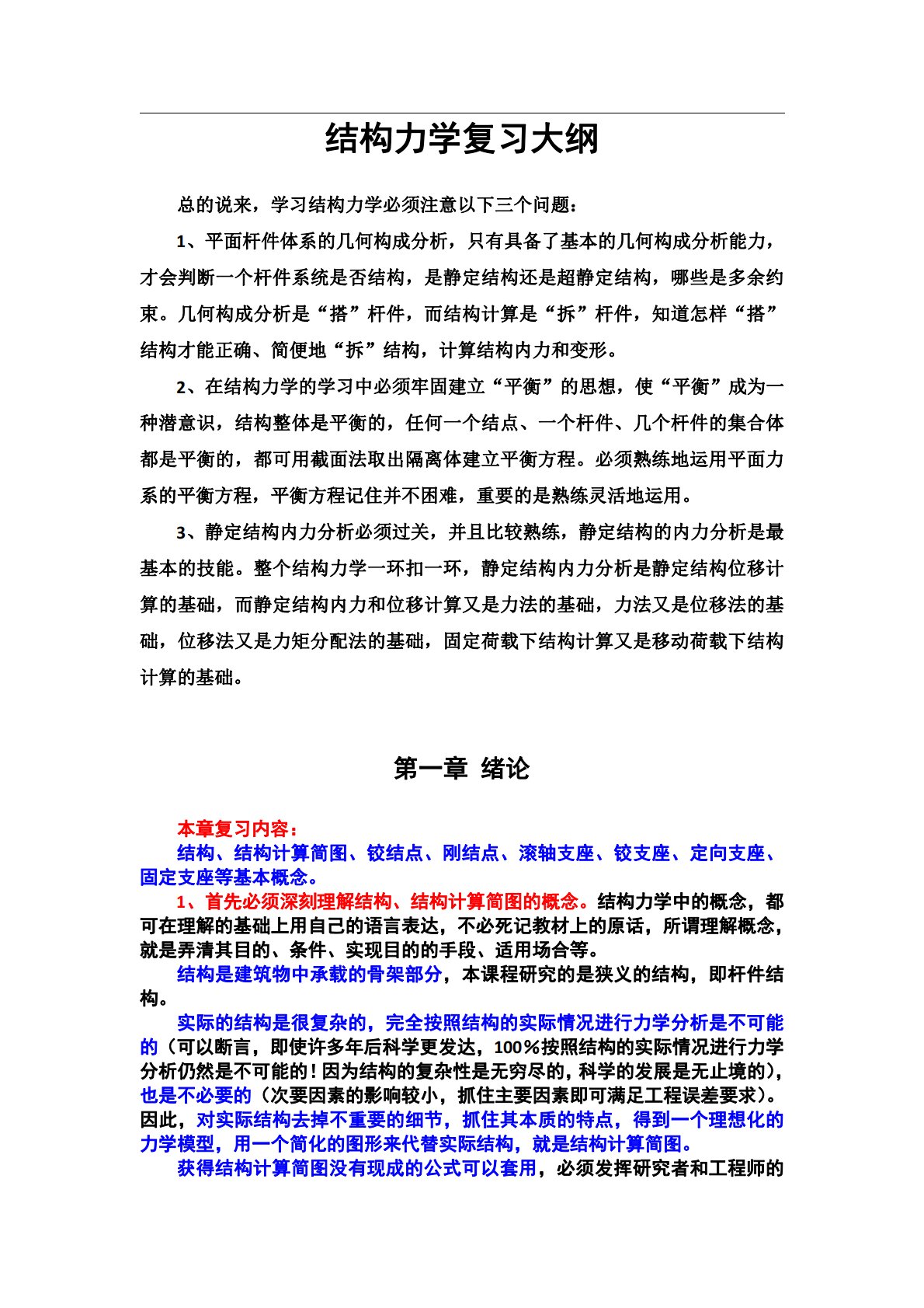 结构力学复习大纲总的说来,学习结构力学必须注意以下三个问题:1、平面杆件体系的几何构成分析,只有具备了基本的几何构成分析能力,才会判断一个杆件系统是否结构,是静定结构还是超静定结构,哪些是多余约束。几何构成分析是“搭”杆件,而结构计算是“拆”杆件,知道怎样“搭”结构才能正确、简便地“拆”结构,计算结构内力和变形。2、在结构力学的学习中必须牢固建立“平衡”的思想,使“平衡”成为一种潜意识,结构整体是平衡的,任何一个结点、一个杆件、几个杆件的集合体都是平衡的,都可用截面法取出隔离体建立平衡方程。必须熟练地运用平面力系的平衡方程,平衡方程记住并不困难,重要的是熟练灵活地运用。3、静定结构内力分析必须...