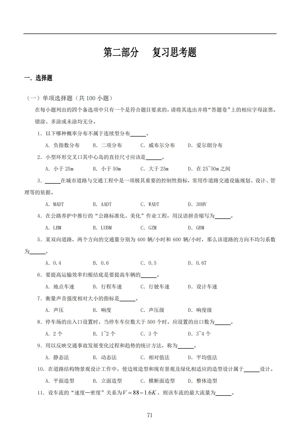第二部分复习思考题一.选择题(一)单项选择题(共100小题)在每小题列出的四个备选项中只有一个是符合题目要求的,请将其选出并将“答题卷”上的相应字母涂黑。错涂、多涂或未涂均无分。1.以下哪种概率分布不属于连续型分布。A.负指数分布B.二项分布C.威布尔分布D.爱尔朗分布2.小型环形交叉口其中心岛的直径尺寸应该是。A.小于25mB.小于50mC.大于25mD.在25~50m之间3.在城市道路与交通工程中是一项极其重要的控制性指标,常用作道路交通设施规划、设计、管理等的依据。A.MADTB.AADTC.WADTD.30HV4.在公路养护中推行的“公路标准化、美化”作业工程,用汉语拼音缩写为。A.L...