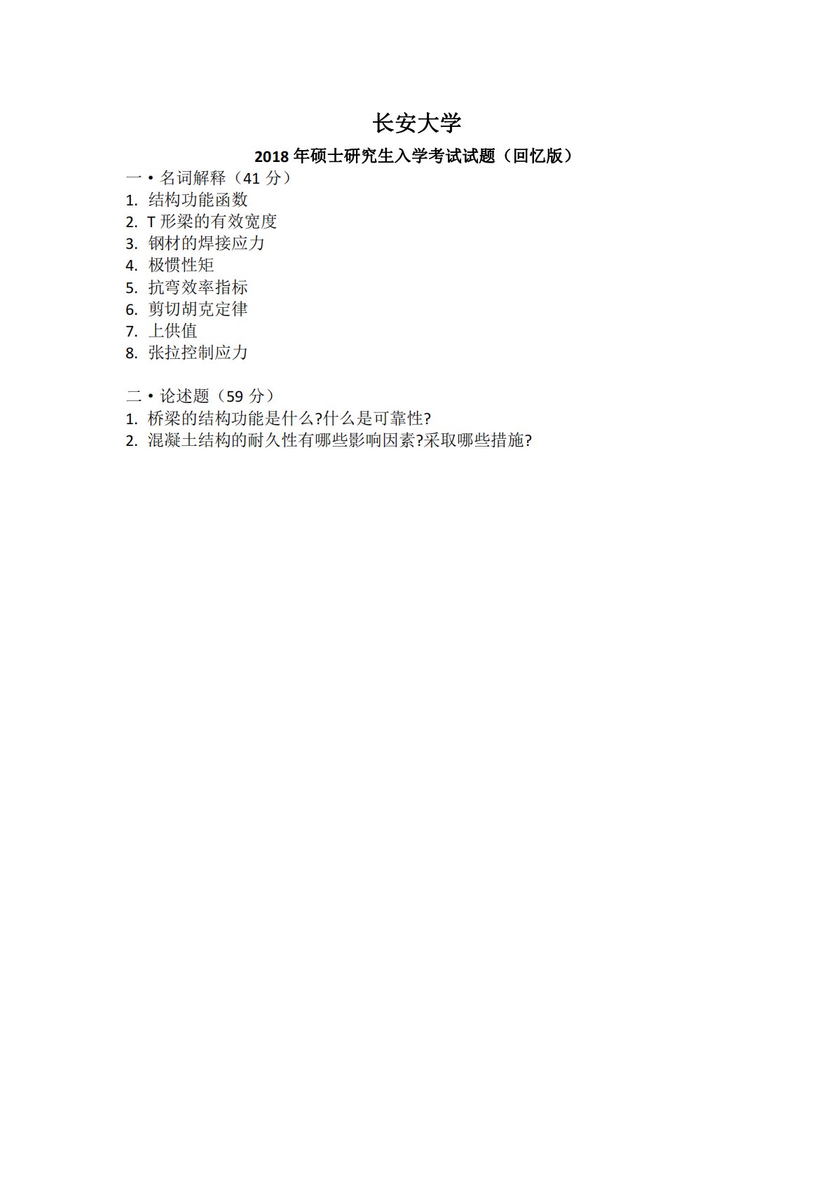 长安大学2018年硕士研究生入学考试试题(回忆版)一·名词解释(41分)1.结构功能函数2.T形梁的有效宽度3.钢材的焊接应力4.极惯性矩5.抗弯效率指标6.剪切胡克定律7.上供值8.张拉控制应力二·论述题(59分)1.桥梁的结构功能是什么?什么是可靠性?2.混凝土结构的耐久性有哪些影响因素?采取哪些措施?长安大学2018年硕士研究生入学考试试题(回忆版)一·名词解释(41分)1.结构功能函数2.T形梁的有效宽度3.钢材的焊接应力4.极惯性矩5.抗弯效率指标6.剪切胡克定律7.上供值8.张拉控制应力二·论述题(59分)1.桥梁的结构功能是什么?什么是可靠性?2.混凝土结构的耐久性有哪些影响因素...