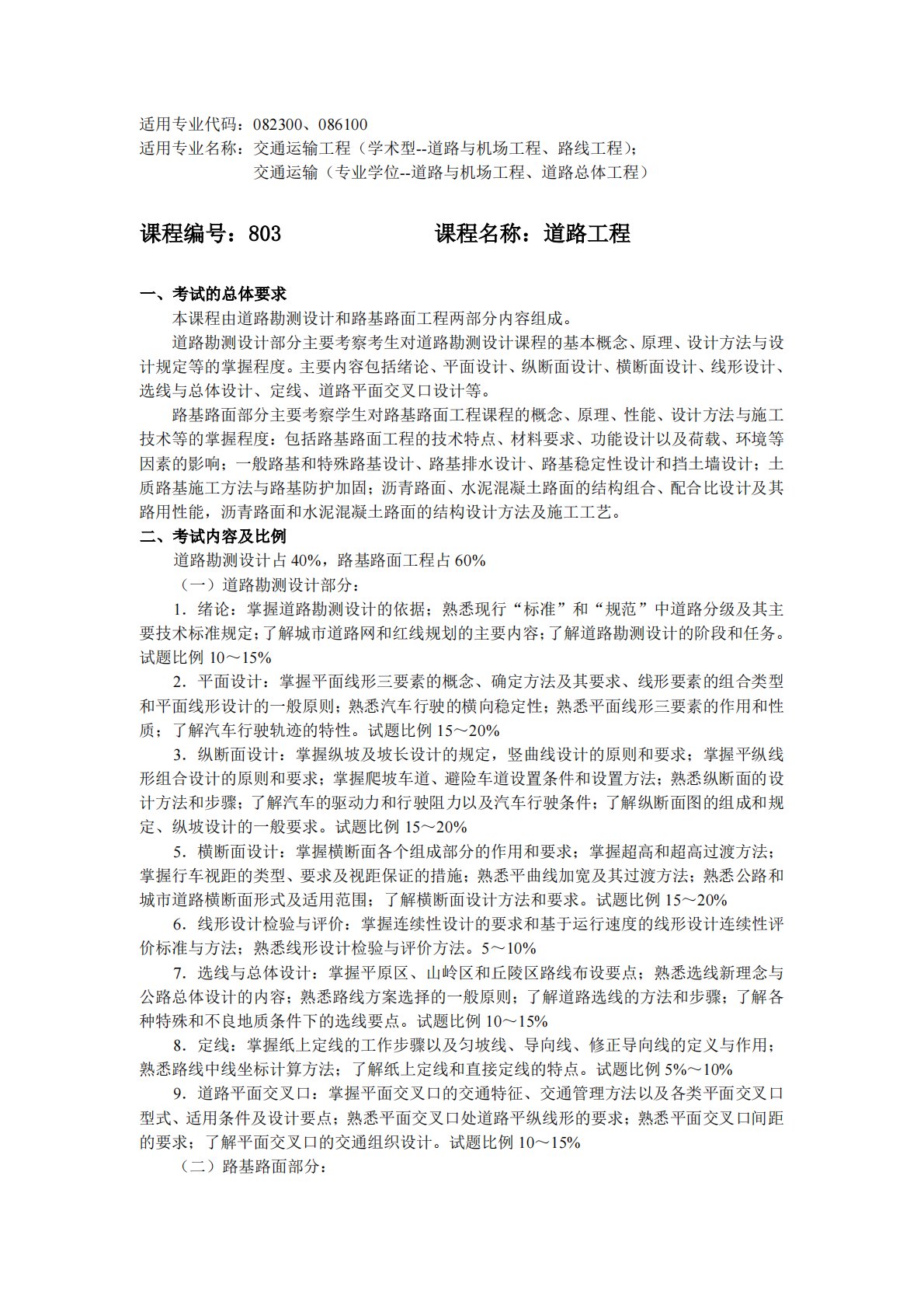 适用专业代码:082300、086100适用专业名称:交通运输工程(学术型--道路与机场工程、路线工程);交通运输(专业学位--道路与机场工程、道路总体工程)课程编号:803课程名称:道路工程一、考试的总体要求本课程由道路勘测设计和路基路面工程两部分内容组成。道路勘测设计部分主要考察考生对道路勘测设计课程的基本概念、原理、设计方法与设计规定等的掌握程度。主要内容包括绪论、平面设计、纵断面设计、横断面设计、线形设计、选线与总体设计、定线、道路平面交叉口设计等。路基路面部分主要考察学生对路基路面工程课程的概念、原理、性能、设计方法与施工技术等的掌握程度:包括路基路面工程的技术特点、材料要求、功能设...