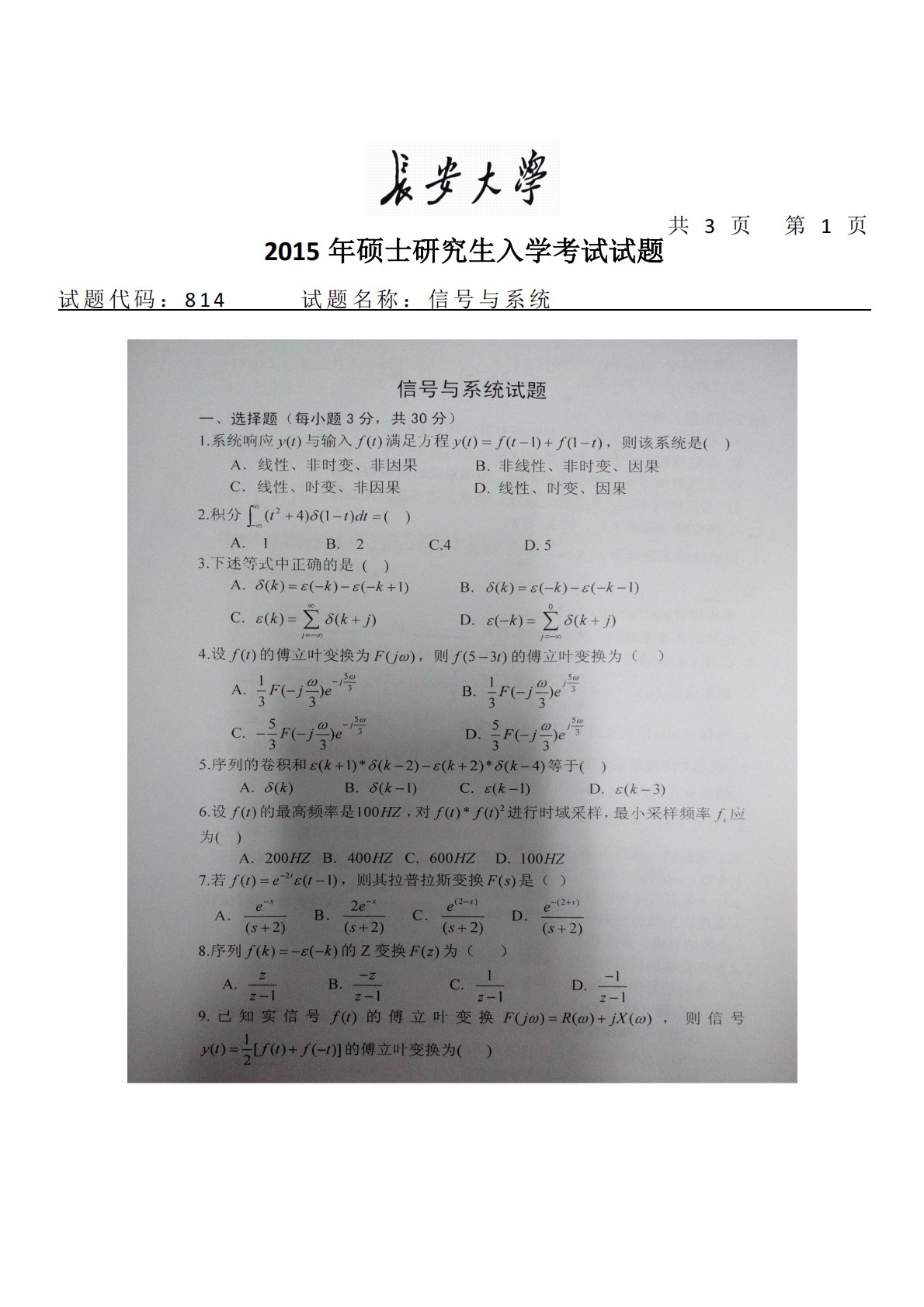 长安大学814信号与系统2015年真题