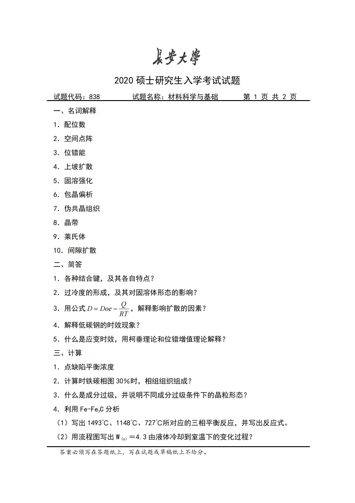 长安大学838材料科学基础2020年真题