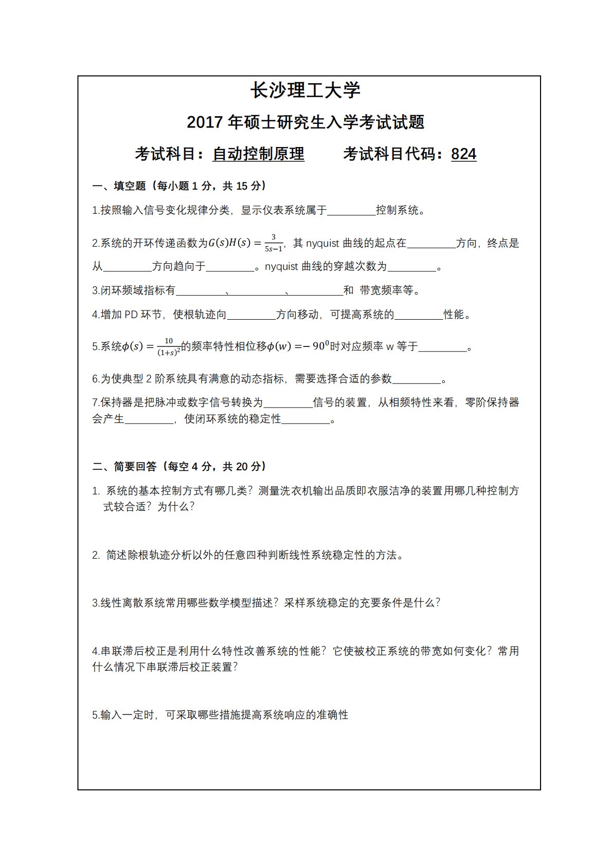长沙理工大学2017年硕士研究生入学考试试题考试科目:自动控制原理考试科目代码:824一、填空题(每小题1分,共15分)1.按照输入信号变化规律分类,显示仪表系统属于控制系统。2.系统的开环传递函数为=35−1,其nyquist曲线的起点在方向,终点是从方向趋向于。nyquist曲线的穿越次数为。3.闭环频域指标有、、和带宽频率等。4.增加PD环节,使根轨迹向方向移动,可提高系统的性能。5.系统=101+2的频率特性相位移=−900时对应频率w等于。6.为使典型2阶系统具有满意的动态指标,需要选择合适的参数。7.保持器是把脉冲或数字信号转换为信号的装置,从相频特性来看,零阶保持器会产生,使闭环...