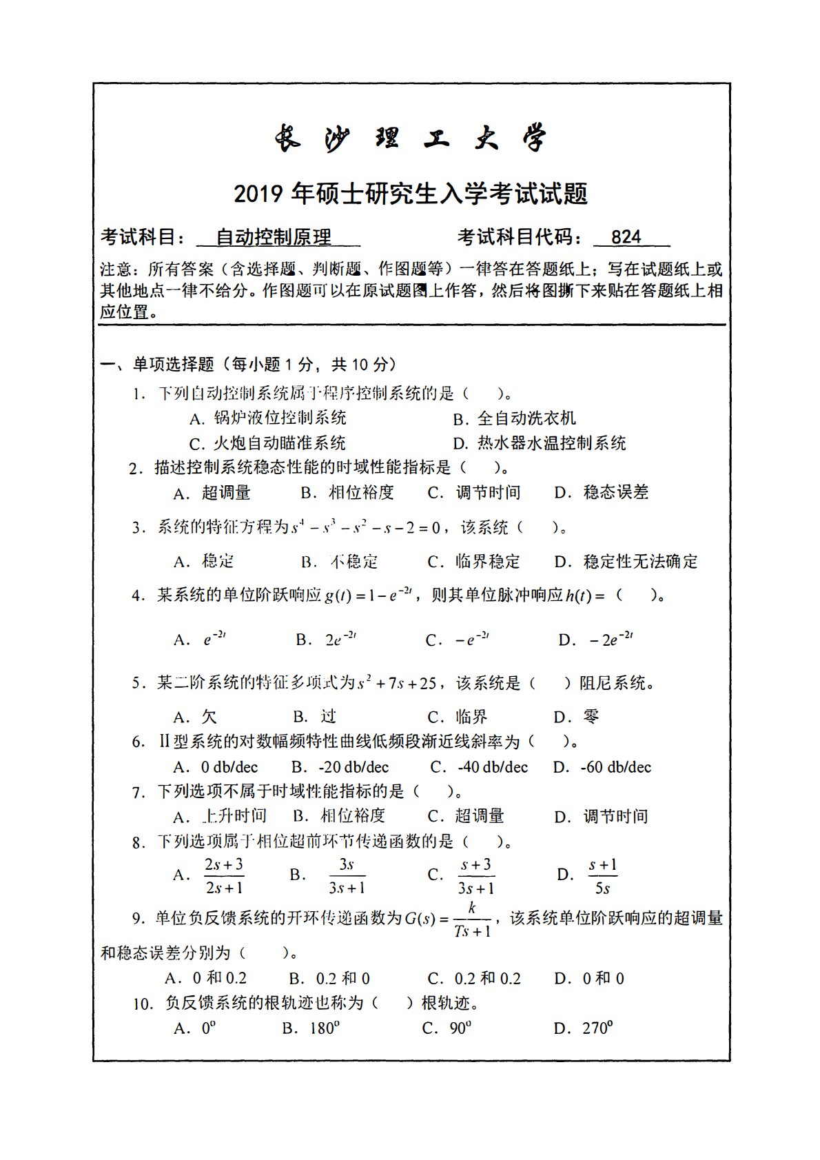 冬沙理工火学2019年硕士研究生入学考试试题考试科目:自动控制原理考试科目代码:824注意:所有答案(含选择题、判断题、作图题等)一律答在答题纸上;写在试题纸上或其他地点一律不给分。作图题可以在原试题招上作答,然后将图撕下来贴在答题纸上相应位置。一、单项选择题(每小题1分,共10分)1.下列自动控制系统屈r程序控制系统的是()。A.锅炉液位控制系统B.全自动洗衣机C.火炮自动瞄准系统D.热水器水温控制系统2.描述控制系统稳态性能的时域性能指标是()。A.超调量B.相位裕度C.调节时间D.稳态误差3.系统的特征方程为s·'-s飞一s2-s-2=0,该系统()。A.稳定B.不稳定C.临界稳定D.稳...