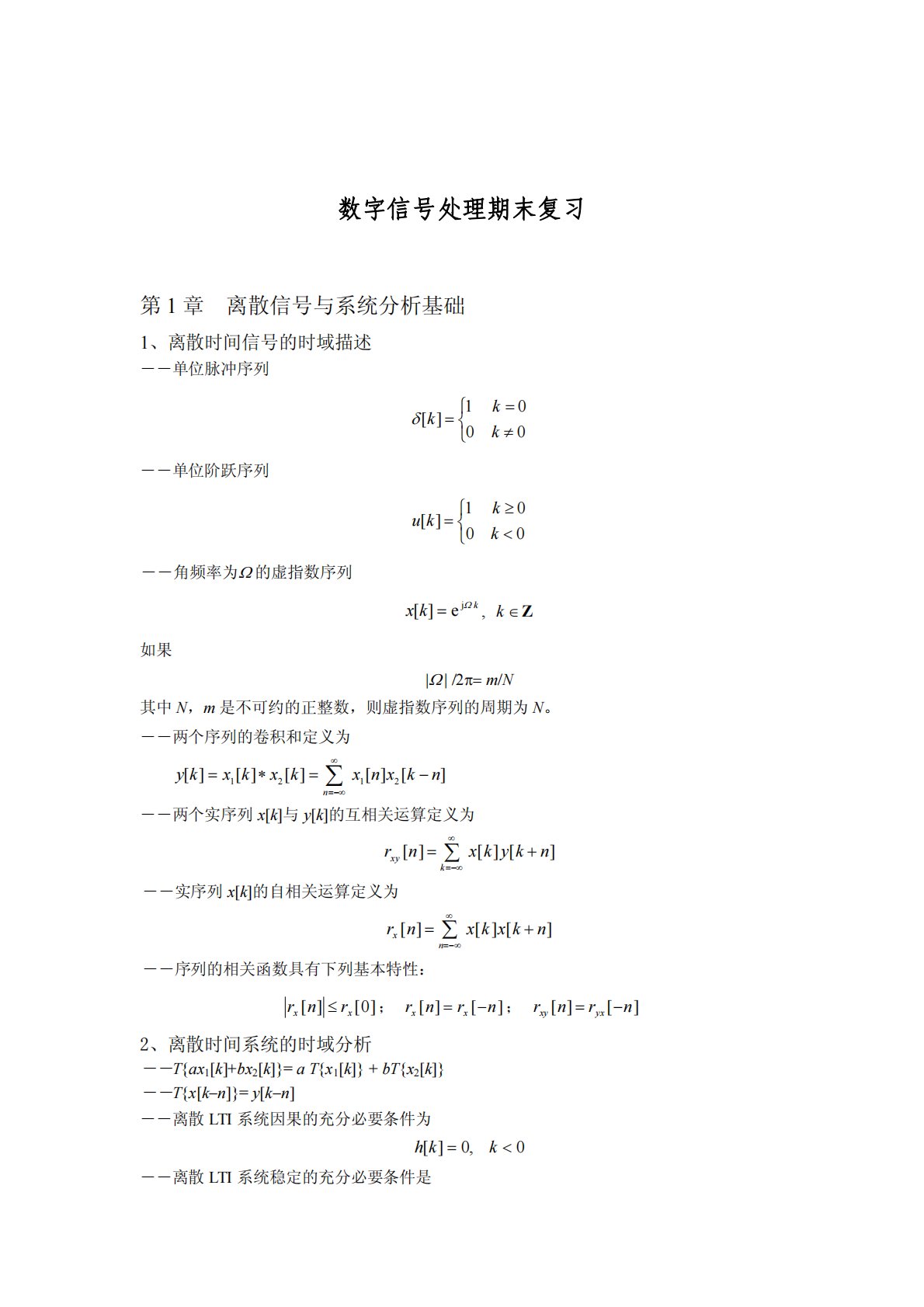数字信号处理期末复习第1章离散信号与系统分析基础1、离散时间信号的时域描述――单位脉冲序列⎩⎨⎧≠==0001][kkkδ――单位阶跃序列⎩⎨⎧<≥=0001][kkku――角频率为Ω的虚指数序列,kkxΩje][=Z∈k如果|Ω|/2π=m/N其中N,m是不可约的正整数,则虚指数序列的周期为N。――两个序列的卷积和定义为][][][][][2121nkxnxkxkxkyn−=∗=∑∞−∞=――两个实序列x[k]与y[k]的互相关运算定义为][][][nkykxnrkxy+=∑∞−∞=――实序列x[k]的自相关运算定义为][][][nkxkxnrnx+=∑∞−∞=――序列的相关函数具有下列基本...