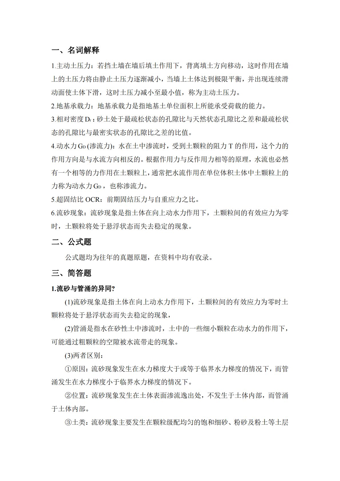 一、名词解释1.主动土压力:若挡土墙在墙后填土作用下,背离填土方向移动,这时作用在墙上的土压力将由静止土压力逐渐减小,当墙上土体达到极限平衡,并出现连续滑动面使土体下滑,这时土压力减小至最小值,称为主动土压力。2.地基承载力:地基承载力是指地基土单位面积上所能承受荷载的能力。3.相对密度rD:砂土处于最疏松状态的孔隙比与天然状态孔隙比之差和最疏松状态的孔隙比与最密实状态的孔隙比之差的比值。4.动水力DG(渗流力):水在土中渗流时,受到土颗粒的阻力T的作用,这个力的作用方向是与水流方向相反的。根据作用力与反作用力相等的原理,水流也必然有一个相等的力作用在土颗粒上,通常把水流作用在单位体积土体中土...