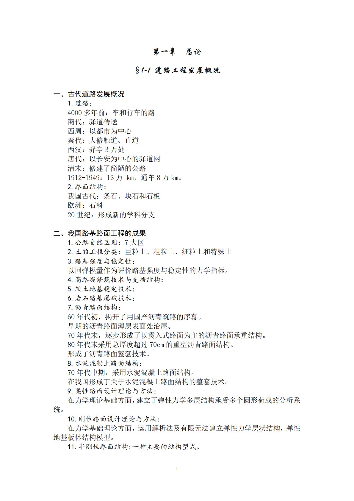 1第一章总论§1-1道路工程发展概况一、古代道路发展概况1.道路:4000多年前:车和行车的路商代:驿道传送西周:以都市为中心秦代:大修驰道、直道西汉:驿亭3万处唐代:以长安为中心的驿道网清末:修建了简陋的公路1912-1949:13万km,通车8万km。2.路面结构:我国古代:条石、块石和石板欧洲:石料20世纪:形成新的学科分支二、我国路基路面工程的成果1.公路自然区划:7大区2.土的工程分类:巨粒土、粗粒土、细粒土和特殊土3.路基强度与稳定性:以回弹模量作为评价路基强度与稳定性的力学指标。4.高路堤修筑技术与支挡结构:5.软土地基稳定技术:6.岩石路基爆破技术:7.沥青路面结构:60年代初...