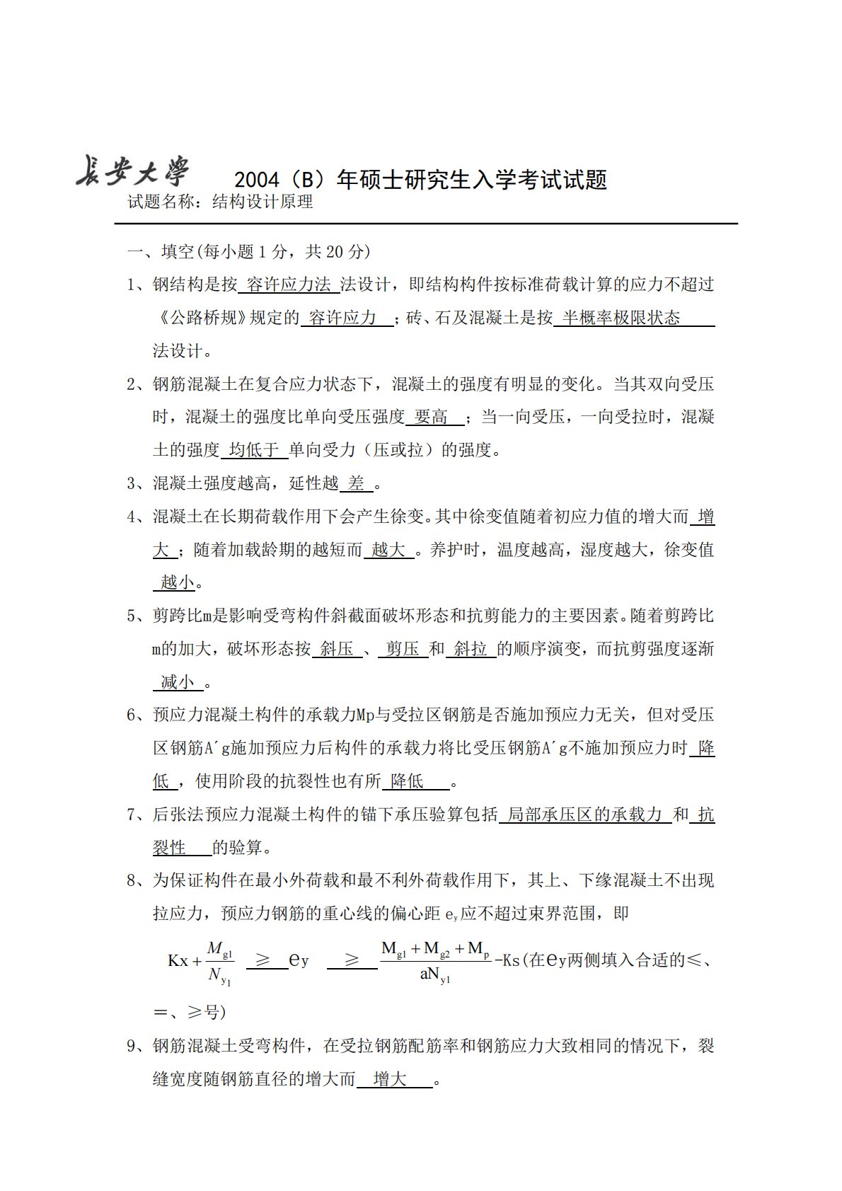 2004(B)年硕士研究生入学考试试题试题名称:结构设计原理一、填空(每小题1分,共20分)1、钢结构是按容许应力法法设计,即结构构件按标准荷载计算的应力不超过《公路桥规》规定的容许应力;砖、石及混凝土是按半概率极限状态法设计。2、钢筋混凝土在复合应力状态下,混凝土的强度有明显的变化。当其双向受压时,混凝土的强度比单向受压强度要高;当一向受压,一向受拉时,混凝土的强度均低于单向受力(压或拉)的强度。3、混凝土强度越高,延性越差。4、混凝土在长期荷载作用下会产生徐变。其中徐变值随着初应力值的增大而增大;随着加载龄期的越短而越大。养护时,温度越高,湿度越大,徐变值越小。5、剪跨比m是影响受弯构件斜...
