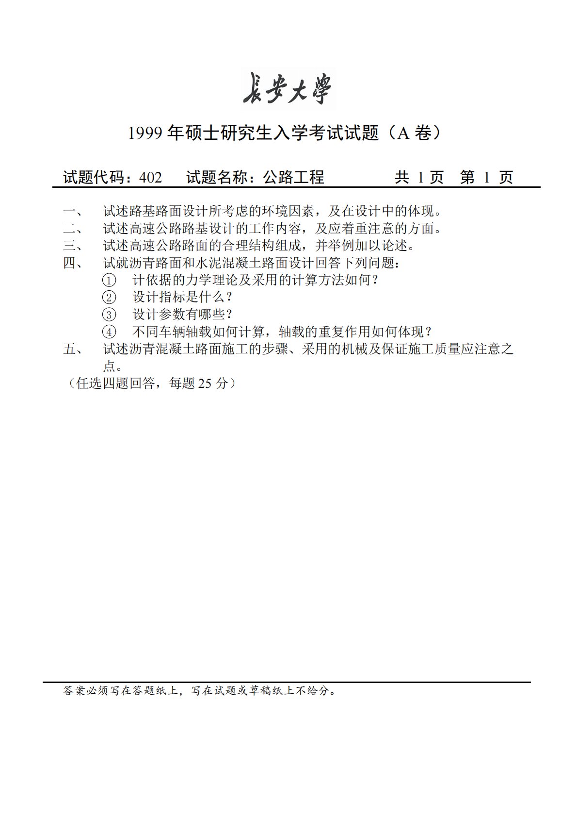 1999年硕士研究生入学考试试题(A卷)试题代码:402试题名称:公路工程共1页第1页一、试述路基路面设计所考虑的环境因素,及在设计中的体现。二、试述高速公路路基设计的工作内容,及应着重注意的方面。三、试述高速公路路面的合理结构组成,并举例加以论述。四、试就沥青路面和水泥混凝土路面设计回答下列问题:1计依据的力学理论及采用的计算方法如何?2设计指标是什么?3设计参数有哪些?4不同车辆轴载如何计算,轴载的重复作用如何体现?五、试述沥青混凝土路面施工的步骤、采用的机械及保证施工质量应注意之点。(任选四题回答,每题25分)答案必须写在答题纸上,写在试题或草稿纸上不给分。1999年硕士研究生入学考试试...