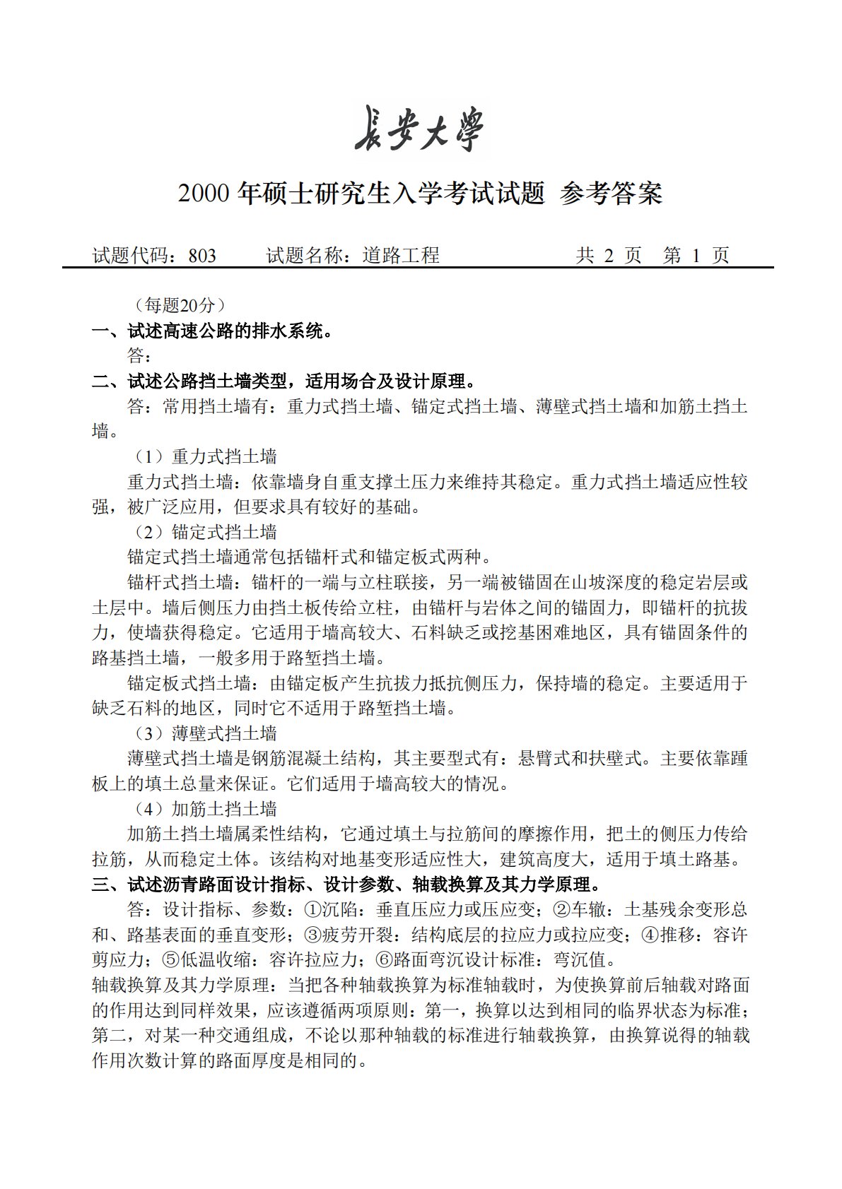 2000年硕士研究生入学考试试题参考答案试题代码:803试题名称:道路工程共2页第1页(每题20分)一、试述高速公路的排水系统。答:二、试述公路挡土墙类型,适用场合及设计原理。答:常用挡土墙有:重力式挡土墙、锚定式挡土墙、薄壁式挡土墙和加筋土挡土墙。(1)重力式挡土墙重力式挡土墙:依靠墙身自重支撑土压力来维持其稳定。重力式挡土墙适应性较强,被广泛应用,但要求具有较好的基础。(2)锚定式挡土墙锚定式挡土墙通常包括锚杆式和锚定板式两种。锚杆式挡土墙:锚杆的一端与立柱联接,另一端被锚固在山坡深度的稳定岩层或土层中。墙后侧压力由挡土板传给立柱,由锚杆与岩体之间的锚固力,即锚杆的抗拔力,使墙获得稳定。它...