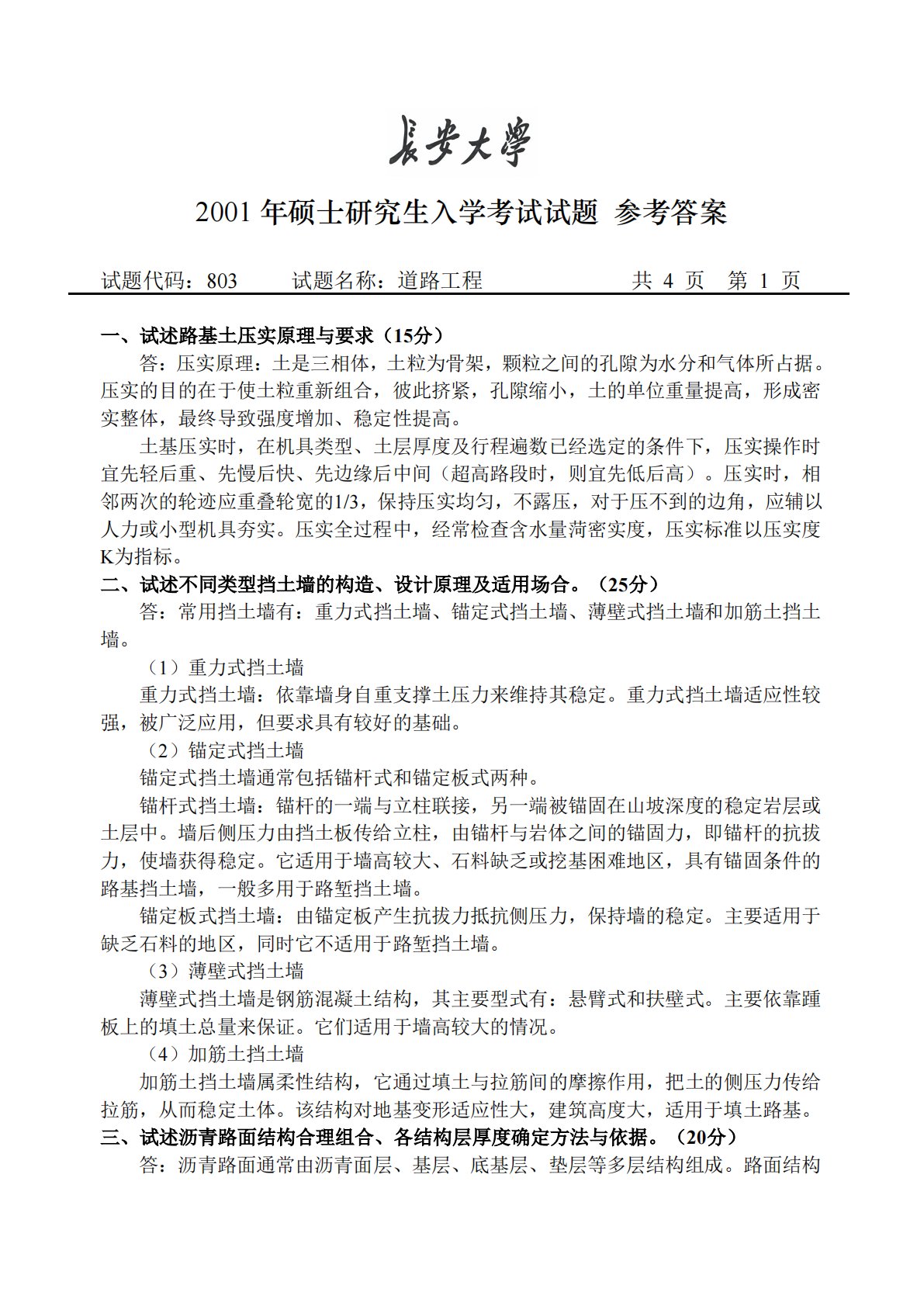 2001年硕士研究生入学考试试题参考答案试题代码:803试题名称:道路工程共4页第1页一、试述路基土压实原理与要求(15分)答:压实原理:土是三相体,土粒为骨架,颗粒之间的孔隙为水分和气体所占据。压实的目的在于使土粒重新组合,彼此挤紧,孔隙缩小,土的单位重量提高,形成密实整体,最终导致强度增加、稳定性提高。土基压实时,在机具类型、土层厚度及行程遍数已经选定的条件下,压实操作时宜先轻后重、先慢后快、先边缘后中间(超高路段时,则宜先低后高)。压实时,相邻两次的轮迹应重叠轮宽的1/3,保持压实均匀,不露压,对于压不到的边角,应辅以人力或小型机具夯实。压实全过程中,经常检查含水量菏密实度,压实标准以压...