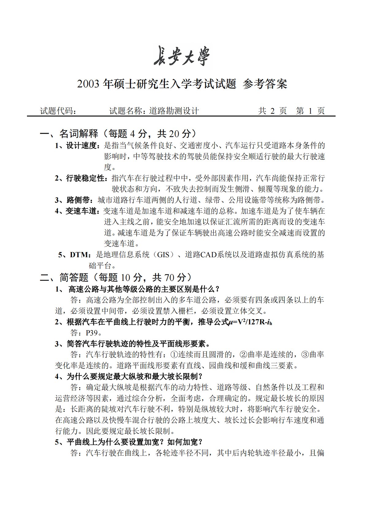 2003年硕士研究生入学考试试题参考答案试题代码:试题名称:道路勘测设计共2页第1页一、名词解释(每题4分,共20分)1、设计速度:是指当气候条件良好、交通密度小、汽车运行只受道路本身条件的影响时,中等驾驶技术的驾驶员能保持安全顺适行驶的最大行驶速度。2、行驶稳定性:指汽车在行驶过程中中,受外部因素作用,汽车尚能保持正常行驶状态和方向,不致失去控制而发生侧滑、倾覆等现象的能力。3、路侧带:城市道路行车道两侧的人行道、绿带、公用设施带等统称为路侧带。4、变速车道:变速车道是加速车道和减速车道的总称。加速车道是为了使车辆在进入主线之前,能安全地加速以保证汇流所需的距离而设的变速车道。减速车道是为了...