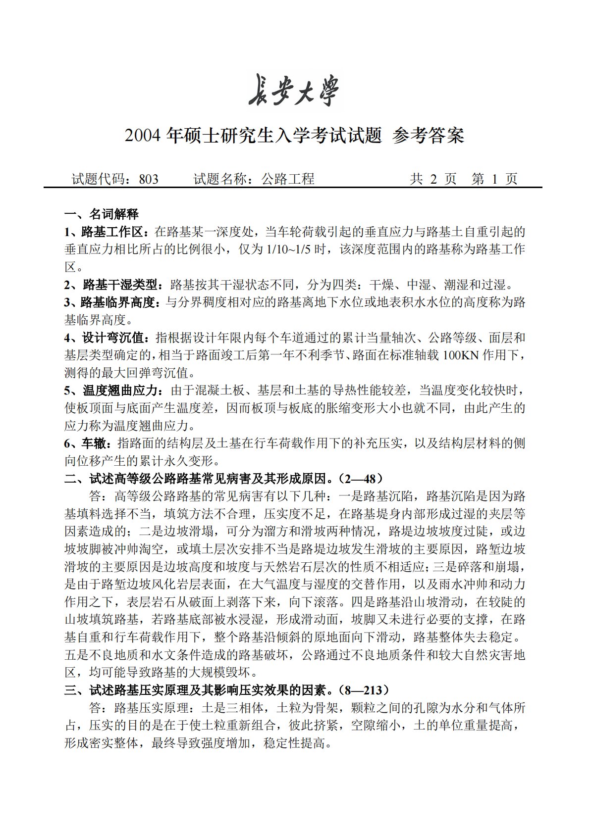 2004年硕士研究生入学考试试题参考答案试题代码:803试题名称:公路工程共2页第1页一、名词解释1、路基工作区:在路基某一深度处,当车轮荷载引起的垂直应力与路基土自重引起的垂直应力相比所占的比例很小,仅为1/10~1/5时,该深度范围内的路基称为路基工作区。2、路基干湿类型:路基按其干湿状态不同,分为四类:干燥、中湿、潮湿和过湿。3、路基临界高度:与分界稠度相对应的路基离地下水位或地表积水水位的高度称为路基临界高度。4、设计弯沉值:指根据设计年限内每个车道通过的累计当量轴次、公路等级、面层和基层类型确定的,相当于路面竣工后第一年不利季节、路面在标准轴载100KN作用下,测得的最大回弹弯沉值。...