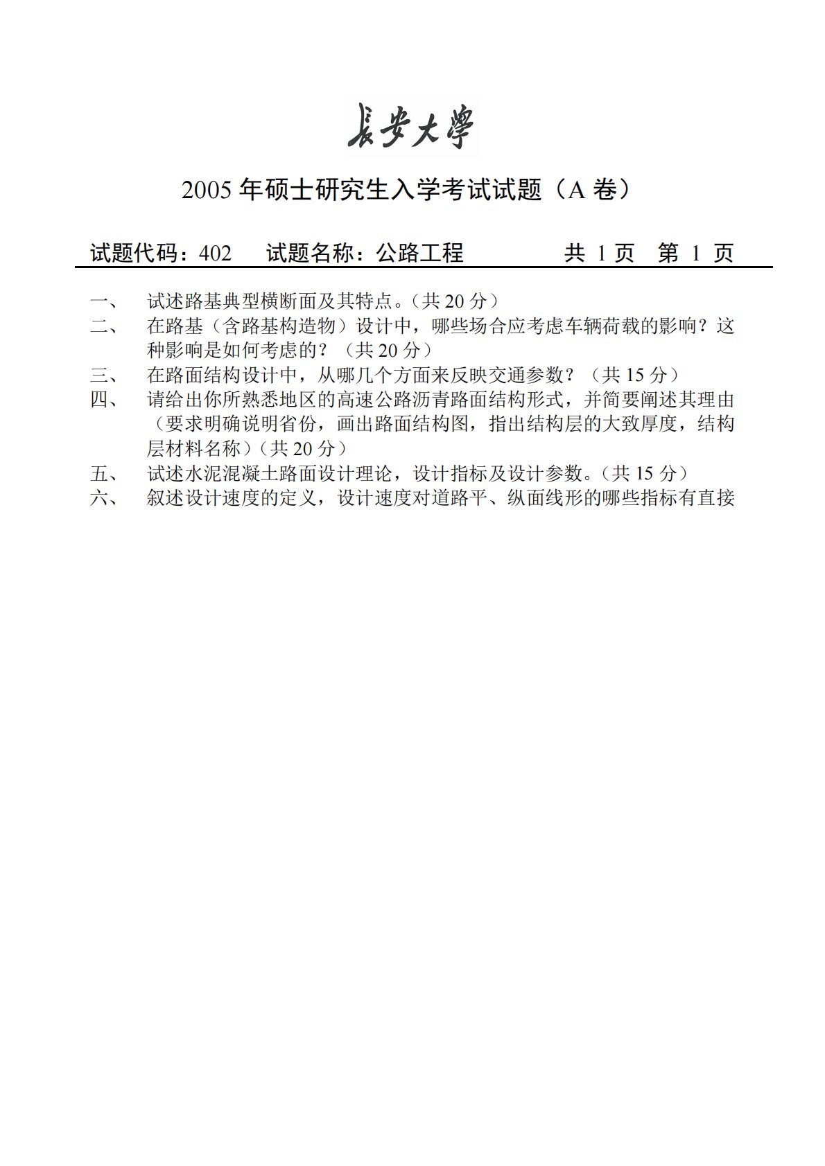 2005年硕士研究生入学考试试题(A卷)试题代码:402试题名称:公路工程共1页第1页一、试述路基典型横断面及其特点。(共20分)二、在路基(含路基构造物)设计中,哪些场合应考虑车辆荷载的影响?这种影响是如何考虑的?(共20分)三、在路面结构设计中,从哪几个方面来反映交通参数?(共15分)四、请给出你所熟悉地区的高速公路沥青路面结构形式,并简要阐述其理由(要求明确说明省份,画出路面结构图,指出结构层的大致厚度,结构层材料名称)(共20分)五、试述水泥混凝土路面设计理论,设计指标及设计参数。(共15分)六、叙述设计速度的定义,设计速度对道路平、纵面线形的哪些指标有直接2005年硕士研究生入学考试...