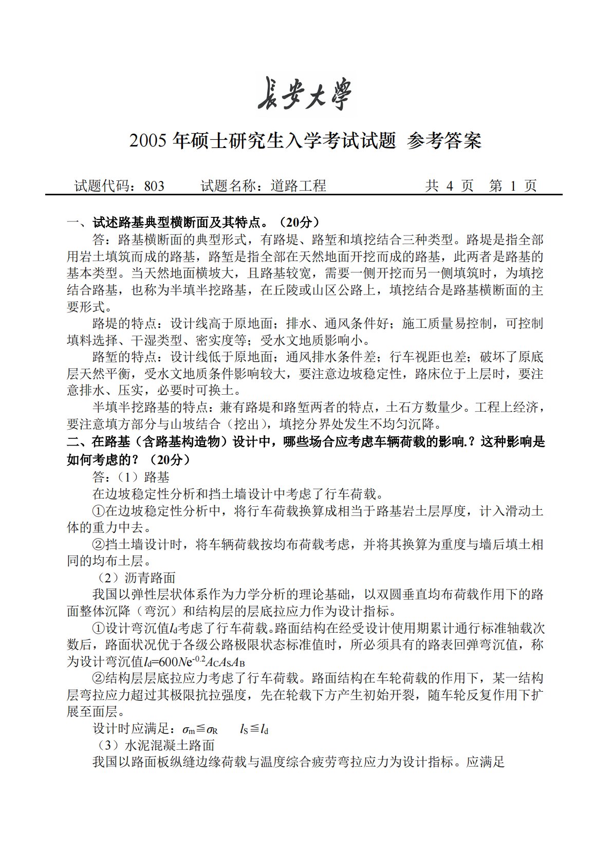 2005年硕士研究生入学考试试题参考答案试题代码:803试题名称:道路工程共4页第1页一、试述路基典型横断面及其特点。(20分)答:路基横断面的典型形式,有路堤、路堑和填挖结合三种类型。路堤是指全部用岩土填筑而成的路基,路堑是指全部在天然地面开挖而成的路基,此两者是路基的基本类型。当天然地面横坡大,且路基较宽,需要一侧开挖而另一侧填筑时,为填挖结合路基,也称为半填半挖路基,在丘陵或山区公路上,填挖结合是路基横断面的主要形式。路堤的特点:设计线高于原地面;排水、通风条件好;施工质量易控制,可控制填料选择、干湿类型、密实度等;受水文地质影响小。路堑的特点:设计线低于原地面;通风排水条件差;行车视距...