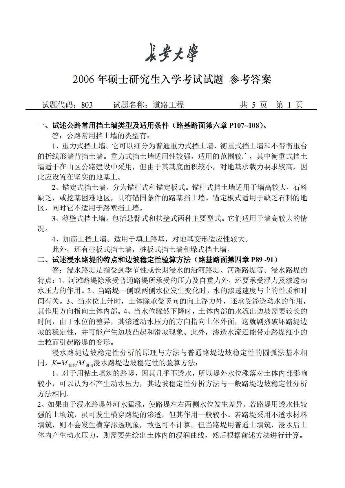 2006年硕士研究生入学考试试题参考答案试题代码:803试题名称:道路工程共5页第1页一、试述公路常用挡土墙类型及适用条件(路基路面第六章P107~108)。答:公路常用挡土墙的类型有:1、重力式挡土墙。它可以细分为普通重力式挡土墙、衡重式挡土墙和不带衡重台的折线形墙背挡土墙。重力式挡土墙适用性较强,适用的范围较广,其中衡重式挡土墙适于在山区公路建设中采用,但由于其基底面积较小,对地基承载力要求较高,因此应设置在坚实的地基上。2、锚定式挡土墙。分为锚杆式和锚定板式。锚杆式挡土墙适用于墙高较大,石料缺乏,或挖基困难地区,具有锚固条件的路基挡土墙。锚定板式适用于缺乏石料的地区,同时它不适用于路堑挡...