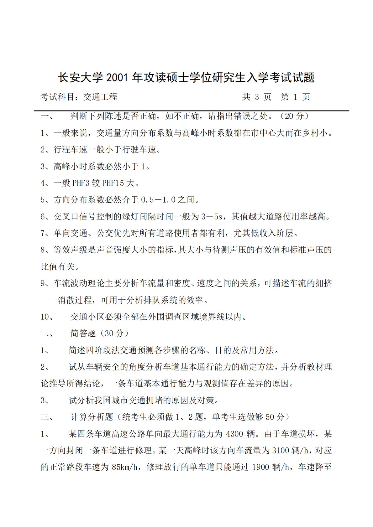 长安大学2001年攻读硕士学位研究生入学考试试题考试科目:交通工程共3页第1页一、判断下列陈述是否正确,如不正确,请指出错误之处。(20分)1、一般来说,交通量方向分布系数与高峰小时系数都在市中心大而在乡村小。2、行程车速一般小于行驶车速。3、高峰小时系数必然小于1。4、一般PHF3较PHF15大。5、方向分布系数必然介于0.5-1.0之间。6、交叉口信号控制的绿灯间隔时间一般为3-5s,其值越大道路使用率越高。7、单向交通、公交优先对所有道路使用者都有利,尤其低收入阶层。8、等效声级是声音强度大小的指标,其大小与待测声压的有效值和标准声压的比值有关。9、车流波动理论主要分析车流量和密度、速度...