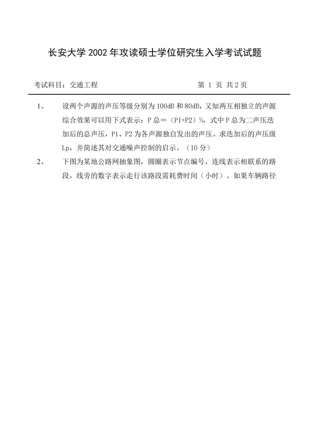 长安大学2002年攻读硕士学位研究生入学考试试题考试科目:交通工程第1页共2页1、设两个声源的声压等级分别为100dB和80dB,又知两互相独立的声源综合效果可以用下式表示:P总=(P1+P2)½,式中P总为二声压迭加后的总声压,P1、P2为各声源独自发出的声压。求迭加后的声压级Lp,并简述其对交通噪声控制的启示。(10分)2、下图为某地公路网抽象图,圆圈表示节点编号,连线表示相联系的路段,线旁的数字表示走行该路段需耗费时间(小时)。如果车辆路径长安大学2002年攻读硕士学位研究生入学考试试题考试科目:交通工程第1页共2页1、设两个声源的声压等级分别为100dB和80dB,又知两互相独立的声源...