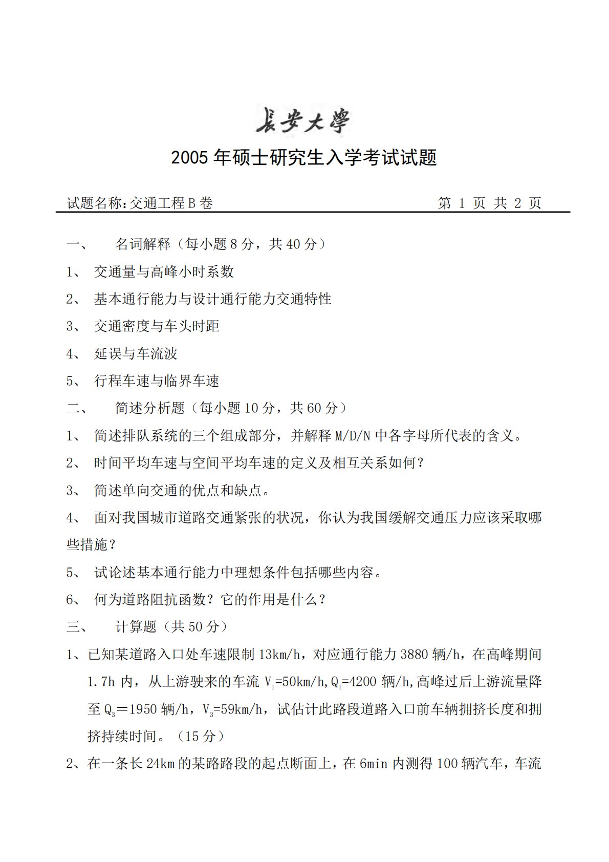 2005年硕士研究生入学考试试题试题名称:交通工程B卷第1页共2页一、名词解释(每小题8分,共40分)1、交通量与高峰小时系数2、基本通行能力与设计通行能力交通特性3、交通密度与车头时距4、延误与车流波5、行程车速与临界车速二、简述分析题(每小题10分,共60分)1、简述排队系统的三个组成部分,并解释M/D/N中各字母所代表的含义。2、时间平均车速与空间平均车速的定义及相互关系如何?3、简述单向交通的优点和缺点。4、面对我国城市道路交通紧张的状况,你认为我国缓解交通压力应该采取哪些措施?5、试论述基本通行能力中理想条件包括哪些内容。6、何为道路阻抗函数?它的作用是什么?三、计算题(共50分)1...