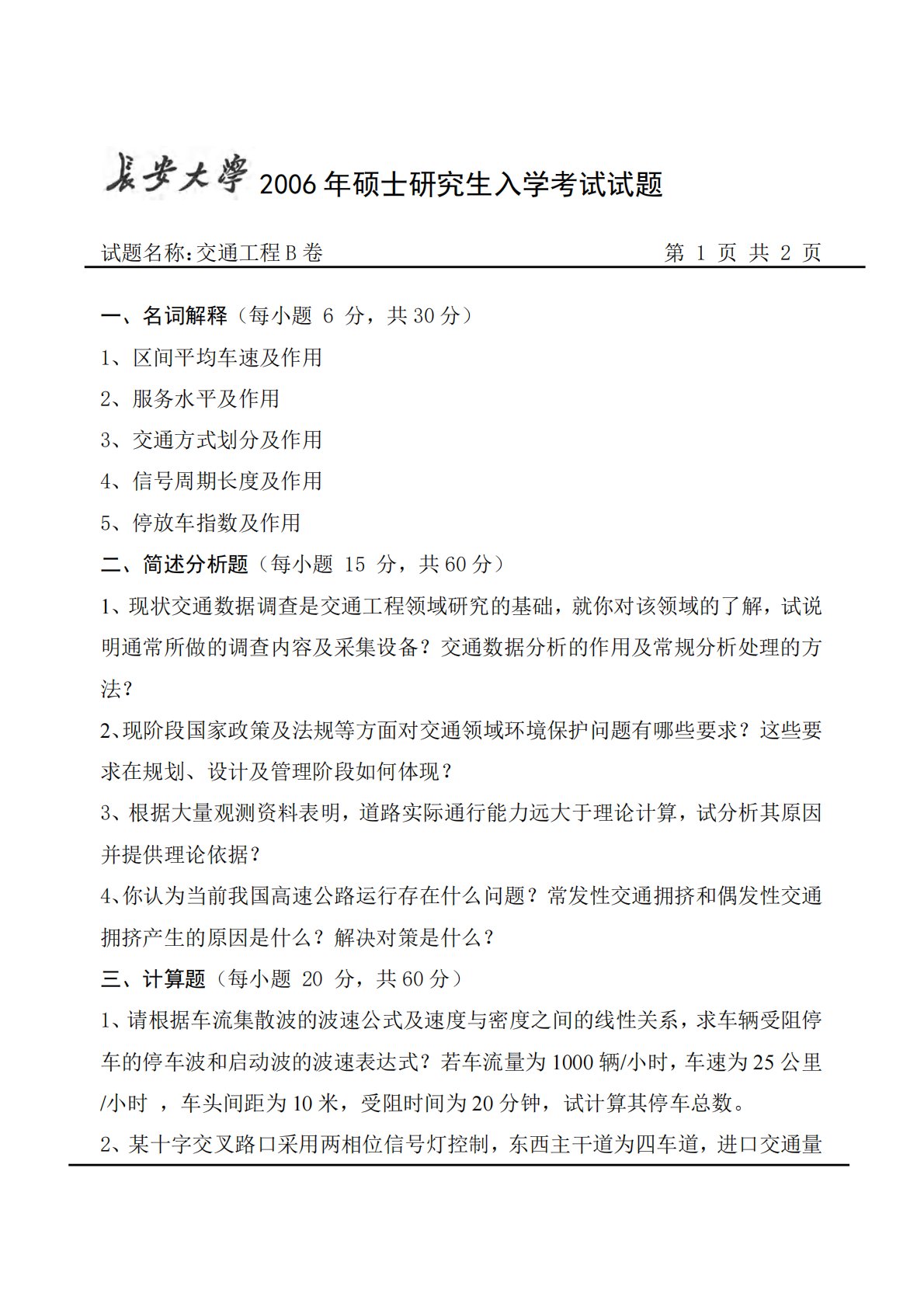 2006年硕士研究生入学考试试题试题名称:交通工程B卷第1页共2页一、名词解释(每小题6分,共30分)1、区间平均车速及作用2、服务水平及作用3、交通方式划分及作用4、信号周期长度及作用5、停放车指数及作用二、简述分析题(每小题15分,共60分)1、现状交通数据调查是交通工程领域研究的基础,就你对该领域的了解,试说明通常所做的调查内容及采集设备?交通数据分析的作用及常规分析处理的方法?2、现阶段国家政策及法规等方面对交通领域环境保护问题有哪些要求?这些要求在规划、设计及管理阶段如何体现?3、根据大量观测资料表明,道路实际通行能力远大于理论计算,试分析其原因并提供理论依据?4、你认为当前我国高速...