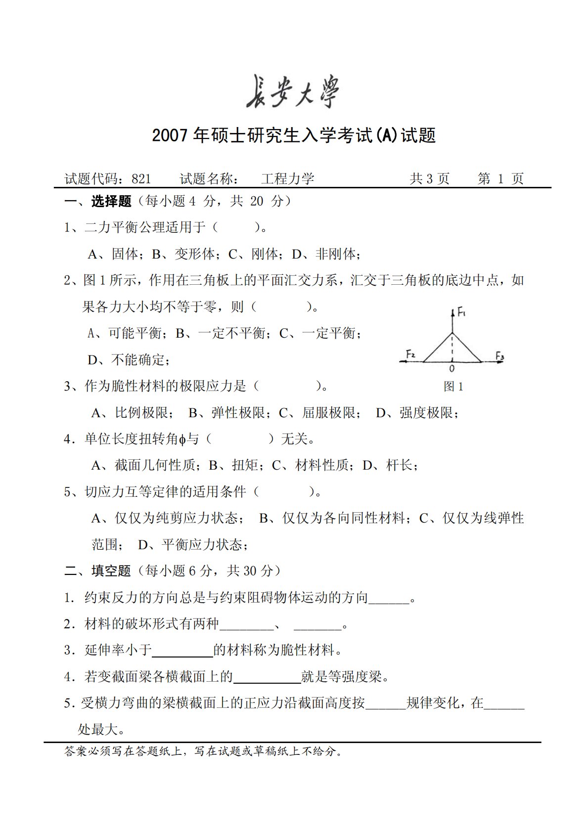 2007年硕士研究生入学考试(A)试题试题代码:821试题名称:工程力学共3页第1页一、选择题(每小题4分,共20分)1、二力平衡公理适用于()。A、固体;B、变形体;C、刚体;D、非刚体;2、图1所示,作用在三角板上的平面汇交力系,汇交于三角板的底边中点,如果各力大小均不等于零,则()。A、可能平衡;B、一定不平衡;C、一定平衡;D、不能确定;3、作为脆性材料的极限应力是()。图1A、比例极限;B、弹性极限;C、屈服极限;D、强度极限;4.单位长度扭转角与()无关。A、截面几何性质;B、扭矩;C、材料性质;D、杆长;5、切应力互等定律的适用条件()。A、仅仅为纯剪应力状态;B、仅仅为各向同...