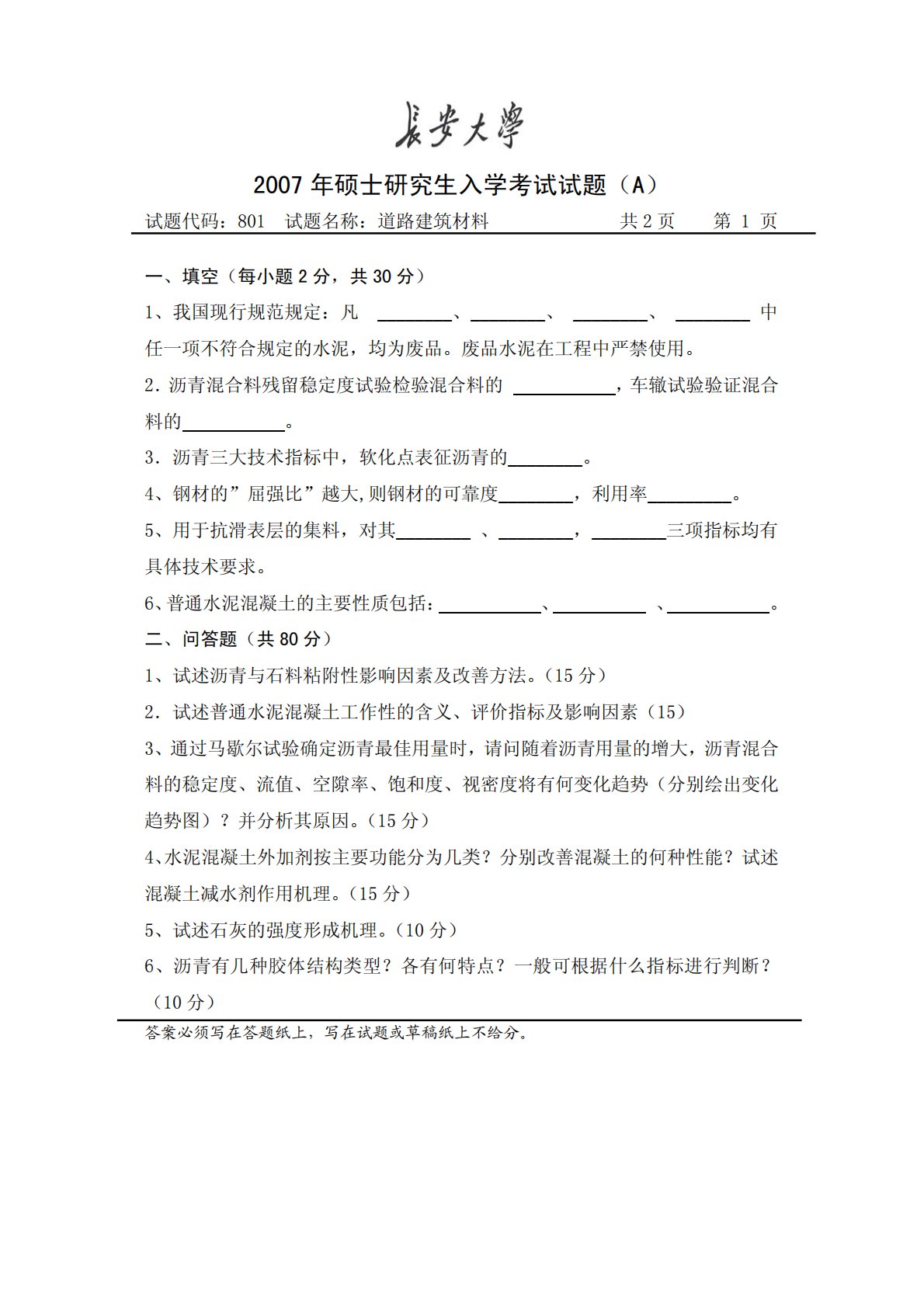 2007年硕士研究生入学考试试题(A)试题代码:801试题名称:道路建筑材料共2页第1页一、填空(每小题2分,共30分)1、我国现行规范规定:凡________、________、________、________中任一项不符合规定的水泥,均为废品。废品水泥在工程中严禁使用。2.沥青混合料残留稳定度试验检验混合料的,车辙试验验证混合料的。3.沥青三大技术指标中,软化点表征沥青的________。4、钢材的”屈强比”越大,则钢材的可靠度________,利用率_________。5、用于抗滑表层的集料,对其________、________,________三项指标均有具体技术要求。6、普通水泥...