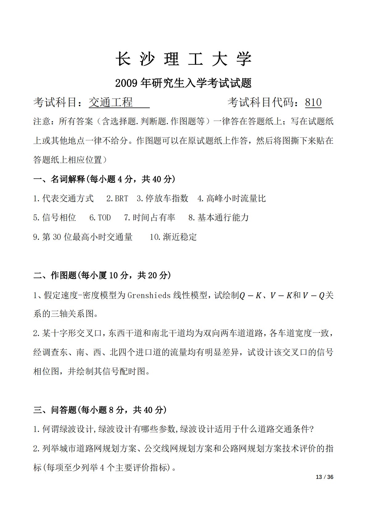 13/36长沙理工大学2009年研究生入学考试试题考试科目:交通工程考试科目代码:810注意:所有答案(含选择题.判断题.作图题等)一律答在答题纸上;写在试题纸上或其他地点一律不给分。作图题可以在原试题纸上作答,然后将图撕下来贴在答题纸上相应位置)一、名词解释(每小题4分,共40分)1.代表交通方式2.BRT3.停放车指数4.高峰小时流量比5.信号相位6.TOD7.时间占有率8.基本通行能力9.第30位最高小时交通量10.渐近稳定二、作图题(每小厦10分,共20分)1、假定速度-密度模型为Grenshieds线性模型,试绘制−、−和−关系的三轴关系图。2.某十字形交叉口...