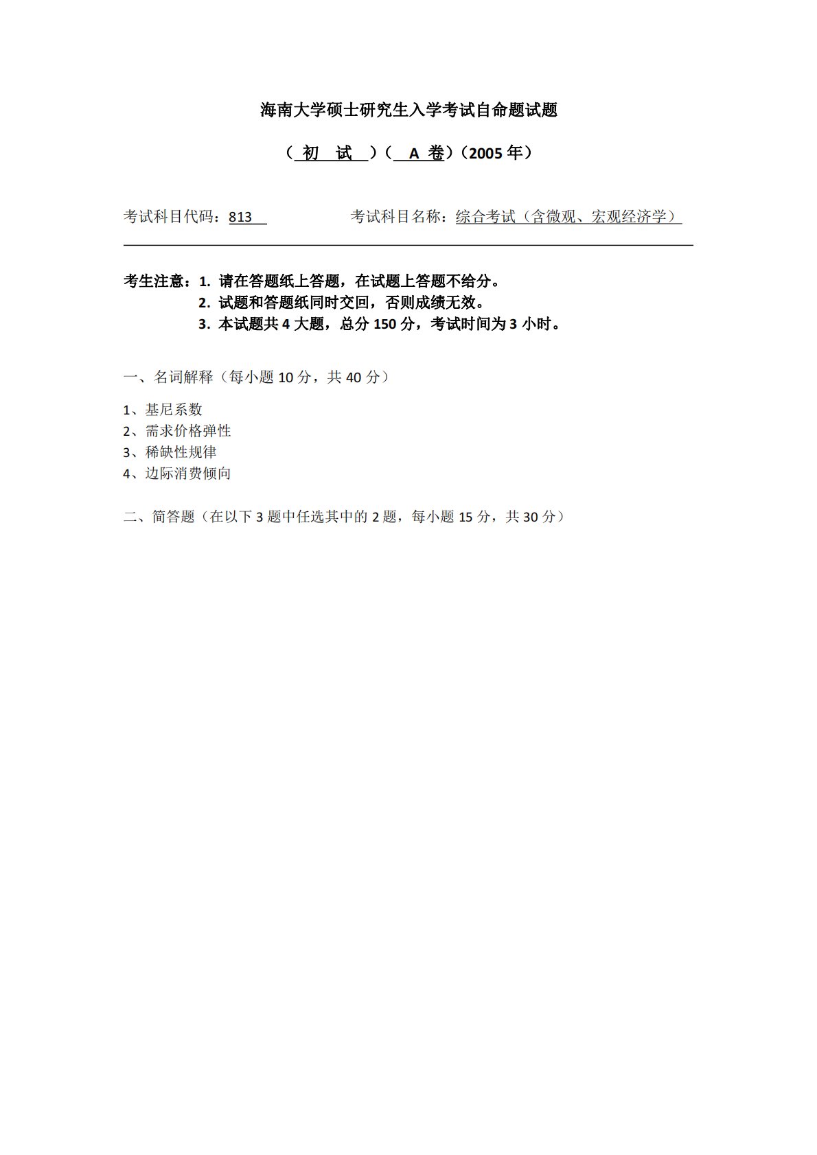 海南大学硕士研究生入学考试自命题试题(初试)(A卷)(2005年)考试科目代码:813考试科目名称:综合考试(含微观、宏观经济学)考生注意:1.请在答题纸上答题,在试题上答题不给分。2.试题和答题纸同时交回,否则成绩无效。3.本试题共4大题,总分150分,考试时间为3小时。一、名词解释(每小题10分,共40分)1、基尼系数2、需求价格弹性3、稀缺性规律4、边际消费倾向二、简答题(在以下3题中任选其中的2题,每小题15分,共30分)海南大学硕士研究生入学考试自命题试题(初试)(A卷)(2005年)考试科目代码:813考试科目名称:综合考试(含微观、宏观经济学)考生注意:1.请在答题纸上答题,在试...