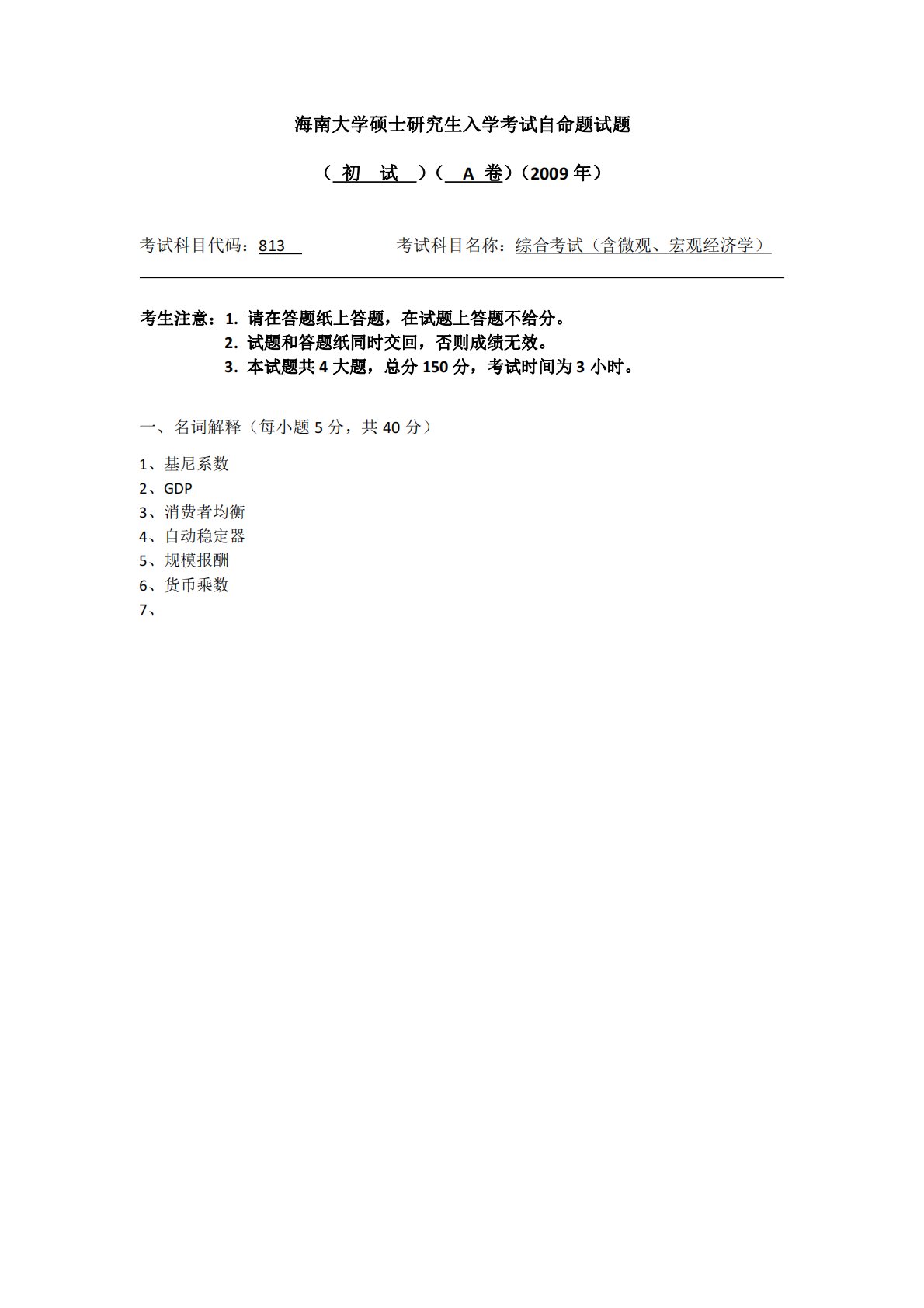 海南大学硕士研究生入学考试自命题试题(初试)(A卷)(2009年)考试科目代码:813考试科目名称:综合考试(含微观、宏观经济学)考生注意:1.请在答题纸上答题,在试题上答题不给分。2.试题和答题纸同时交回,否则成绩无效。3.本试题共4大题,总分150分,考试时间为3小时。一、名词解释(每小题5分,共40分)1、基尼系数2、GDP3、消费者均衡4、自动稳定器5、规模报酬6、货币乘数7、海南大学硕士研究生入学考试自命题试题(初试)(A卷)(2009年)考试科目代码:813考试科目名称:综合考试(含微观、宏观经济学)考生注意:1.请在答题纸上答题,在试题上答题不给分。2.试题和答题纸同时交回,否则...