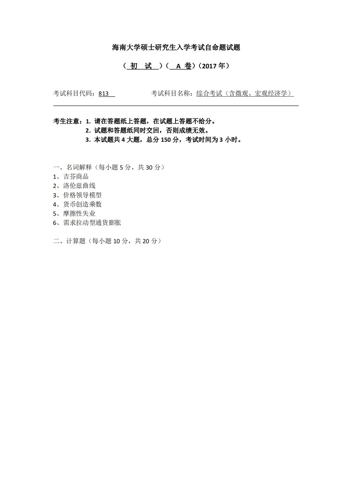 海南大学硕士研究生入学考试自命题试题(初试)(A卷)(2017年)考试科目代码:813考试科目名称:综合考试(含微观、宏观经济学)考生注意:1.请在答题纸上答题,在试题上答题不给分。2.试题和答题纸同时交回,否则成绩无效。3.本试题共4大题,总分150分,考试时间为3小时。一、名词解释(每小题5分,共30分)1、吉芬商品2、洛伦兹曲线3、价格领导模型4、货币创造乘数5、摩擦性失业6、需求拉动型通货膨胀二、计算题(每小题10分,共20分)海南大学硕士研究生入学考试自命题试题(初试)(A卷)(2017年)考试科目代码:813考试科目名称:综合考试(含微观、宏观经济学)考生注意:1.请在答题纸上答题...