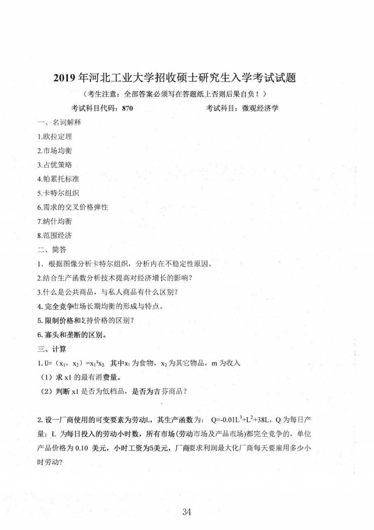 河北工业大学870微观经济学2019年真题